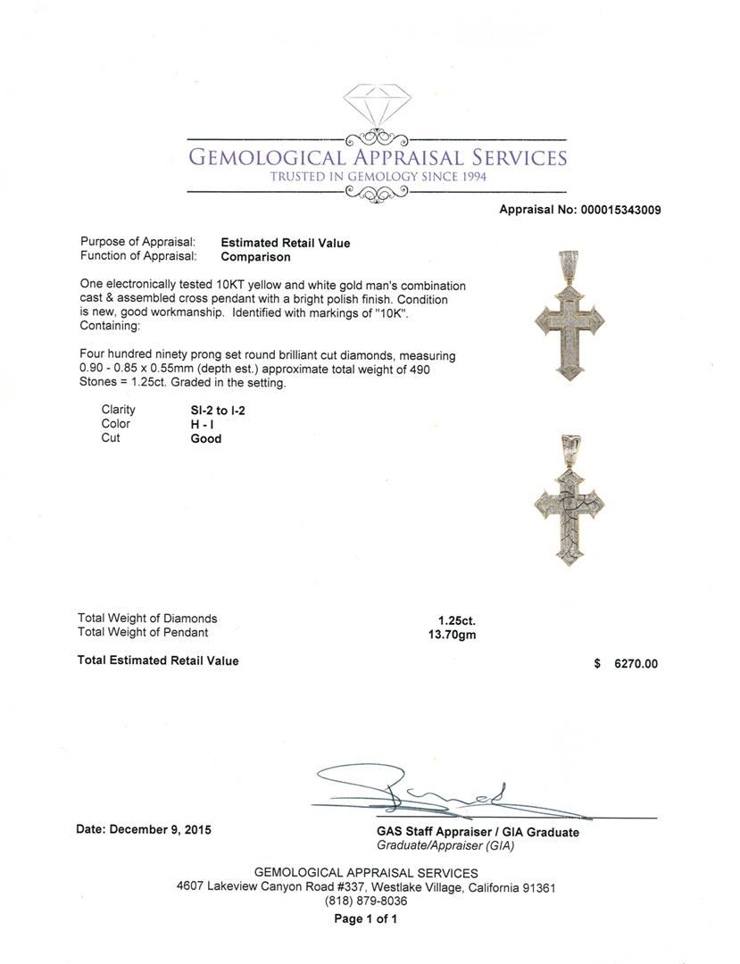 One electronically tested 10KT yellow and white gold man's combination cast & assembled cross pendant with a bright polish finish. Identified with markings of "10K". Condition is new, good workmanship. Containing: Four Hundred Ninety prong set round brilliant cut diamonds, measuring 0.90 - 0.85 x 0.55mm (depth est.) approximate total weight of 490 Stones = 1.25ct. Graded in the setting. Clarity: SI-2 to I-2. Color: H - I. Cut Good. Total Weight of Diamonds 1.25ct. Total Weight of Pendant 13.70gm. GAS Appraised at $6,270.00.