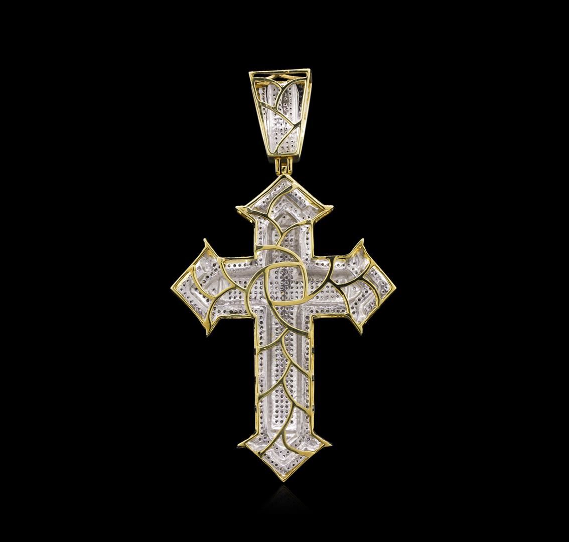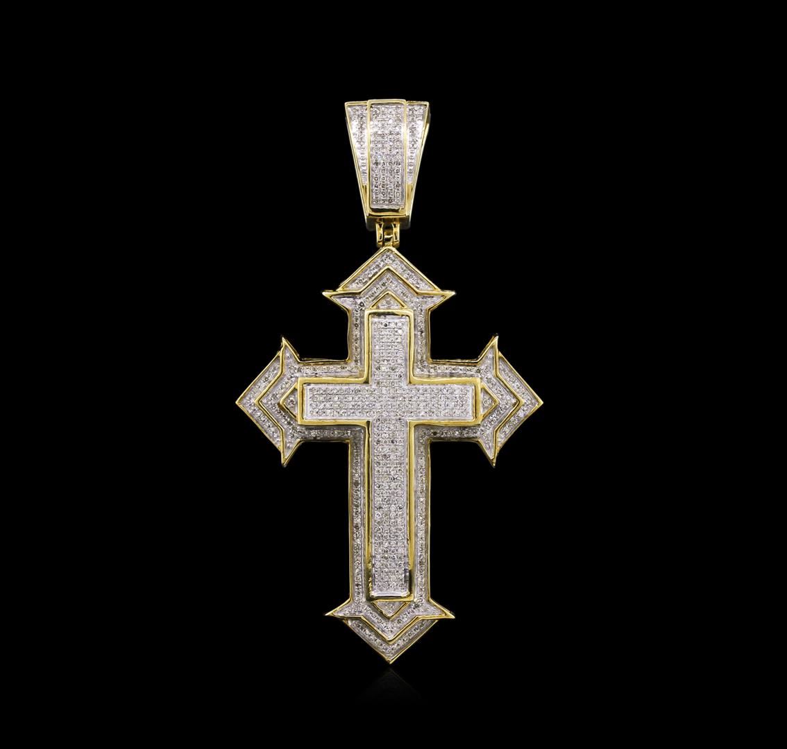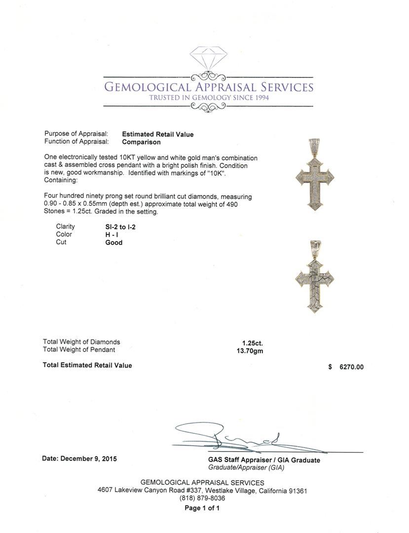 One electronically tested 10KT yellow and white gold man's combination cast & assembled cross pendant with a bright polish finish. Identified with markings of "10K". Condition is new, good workmanship. Containing: Four Hundred Ninety prong set round brilliant cut diamonds, measuring 0.90 - 0.85 x 0.55mm (depth est.) approximate total weight of 490 Stones = 1.25ct. Graded in the setting. Clarity: SI-2 to I-2. Color: H - I. Cut Good. Total Weight of Diamonds 1.25ct. Total Weight of Pendant 13.70gm. GAS Appraised at $6,270.00.