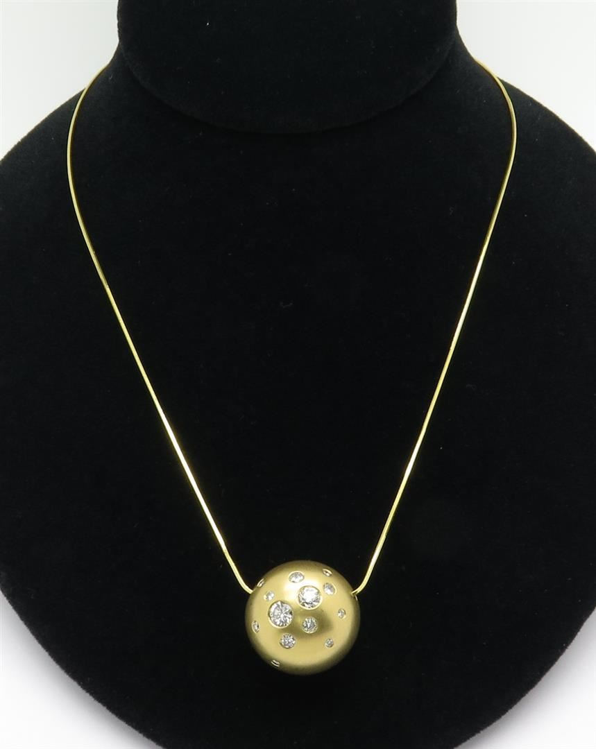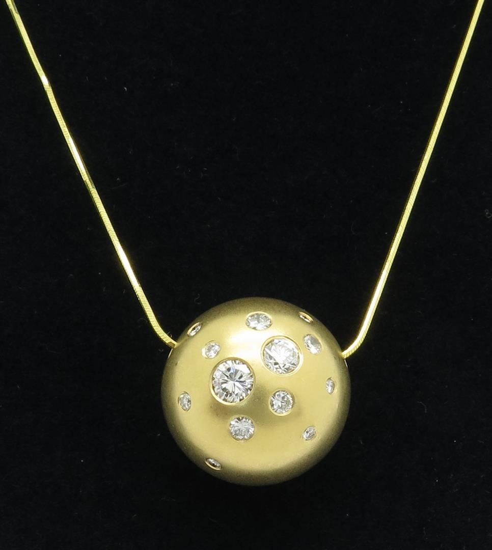 One tested 18K yellow gold designer Etienne Perret diamond galaxy ball pendant. Condition is new. Containing: 15 Round Brilliant Cut Diamonds. Clarity: VS, Color: F-G. Approximate total diamond weight: 1.25CTW. Diamonds are graded in the mounting, unless otherwise stated. Weight of necklace: 17.0 grams. Length of 14K gold chain: 18"