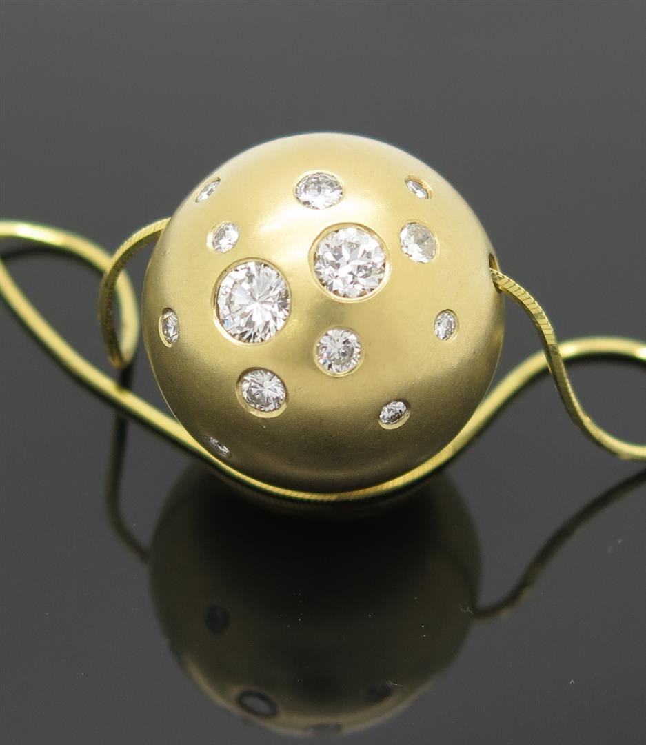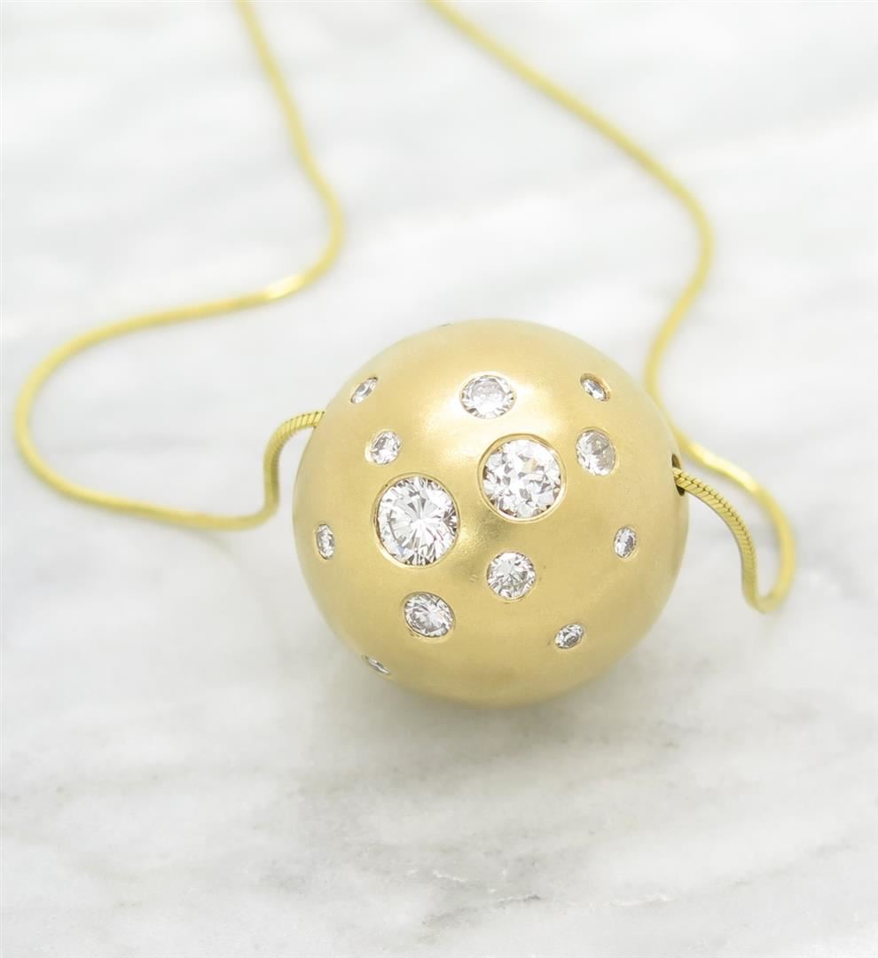 One tested 18K yellow gold designer Etienne Perret diamond galaxy ball pendant. Condition is new. Containing: 15 Round Brilliant Cut Diamonds. Clarity: VS, Color: F-G. Approximate total diamond weight: 1.25CTW. Diamonds are graded in the mounting, unless otherwise stated. Weight of necklace: 17.0 grams. Length of 14K gold chain: 18"