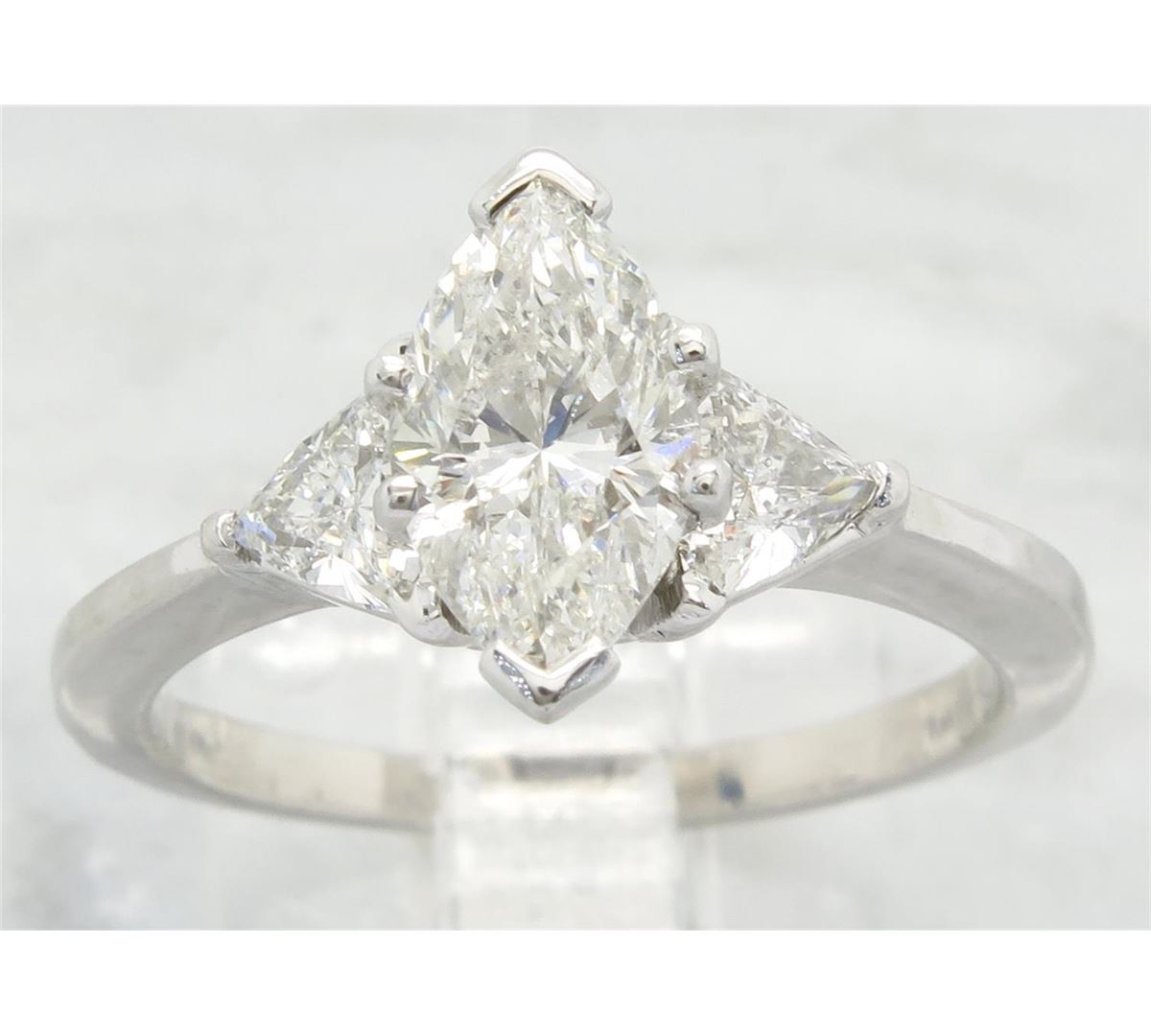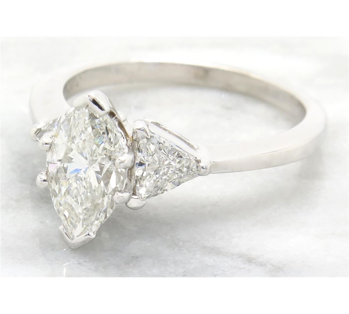 One tested platinum diamond ring. Condition is new. Containing: One Marquise Cut Diamond, Size: .75CT, Clarity: I, Color: G-H. Two Trilliant Cut Diamonds. Approximate total diamond weight: 1.25CTW. Diamonds are graded in the mounting, unless otherwise stated. Weight: 5.9 grams. Size: 6.5