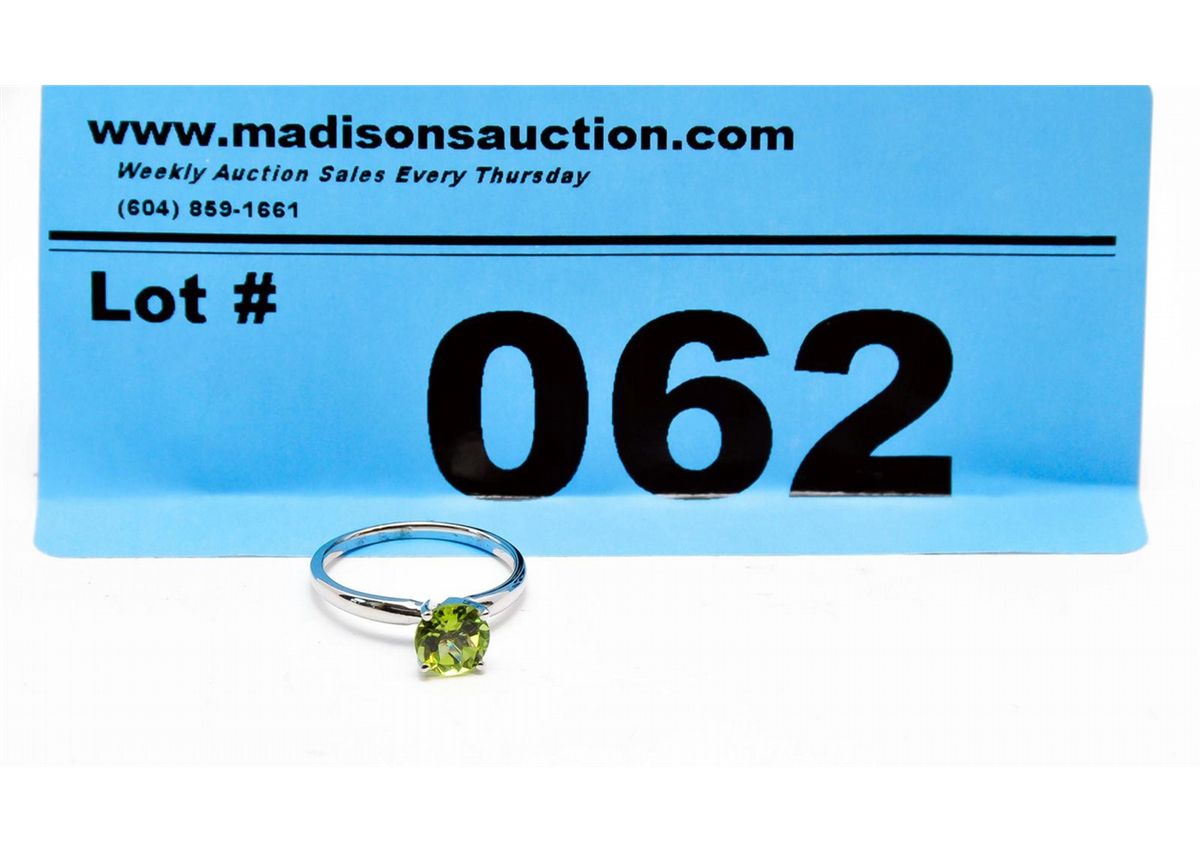 Genuine AA-AAA green round cut peridot gemstone set in 14kt white gold. size 6.5 Estimated price $1290-$1780