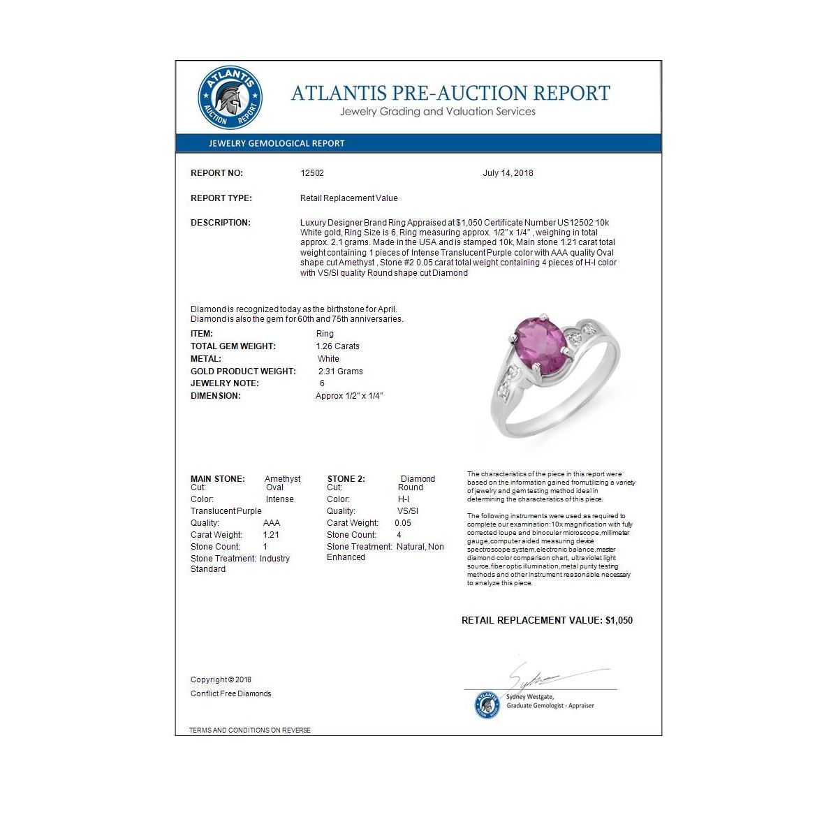 REF-16W2F -12502 ---- 1.26 CTW Amethyst & Diamond Ring 10K White Gold ---- Luxury Designer Brand Ring Appraised at $1,050 Certificate Number US12502 10k White gold, Ring Size is 6, Ring measuring approx. 1/2" x 1/4" , weighing in total approx. 2.1 grams. Made in the USA and is stamped 10k, Main stone 1.21 carat total weight containing 1 pieces of Intense Translucent Purple color with AAA quality Oval shape cut Amethyst , Stone #2 0.05 carat total weight containing 4 pieces of H-I color with VS/SI quality Round shape cut Diamond