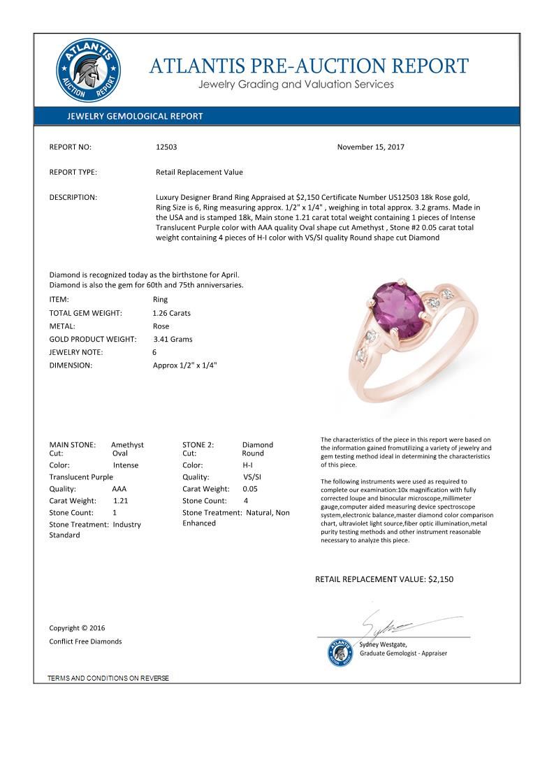 REF-32M8H -12503 ---- 1.26 CTW Amethyst & Diamond Ring 18K Rose Gold ---- Luxury Designer Brand Ring Appraised at $2,150 Certificate Number US12503 18k Rose gold, Ring Size is 6, Ring measuring approx. 1/2" x 1/4" , weighing in total approx. 3.2 grams. Made in the USA and is stamped 18k, Main stone 1.21 carat total weight containing 1 pieces of Intense Translucent Purple color with AAA quality Oval shape cut Amethyst , Stone #2 0.05 carat total weight containing 4 pieces of H-I color with VS/SI quality Round shape cut Diamond