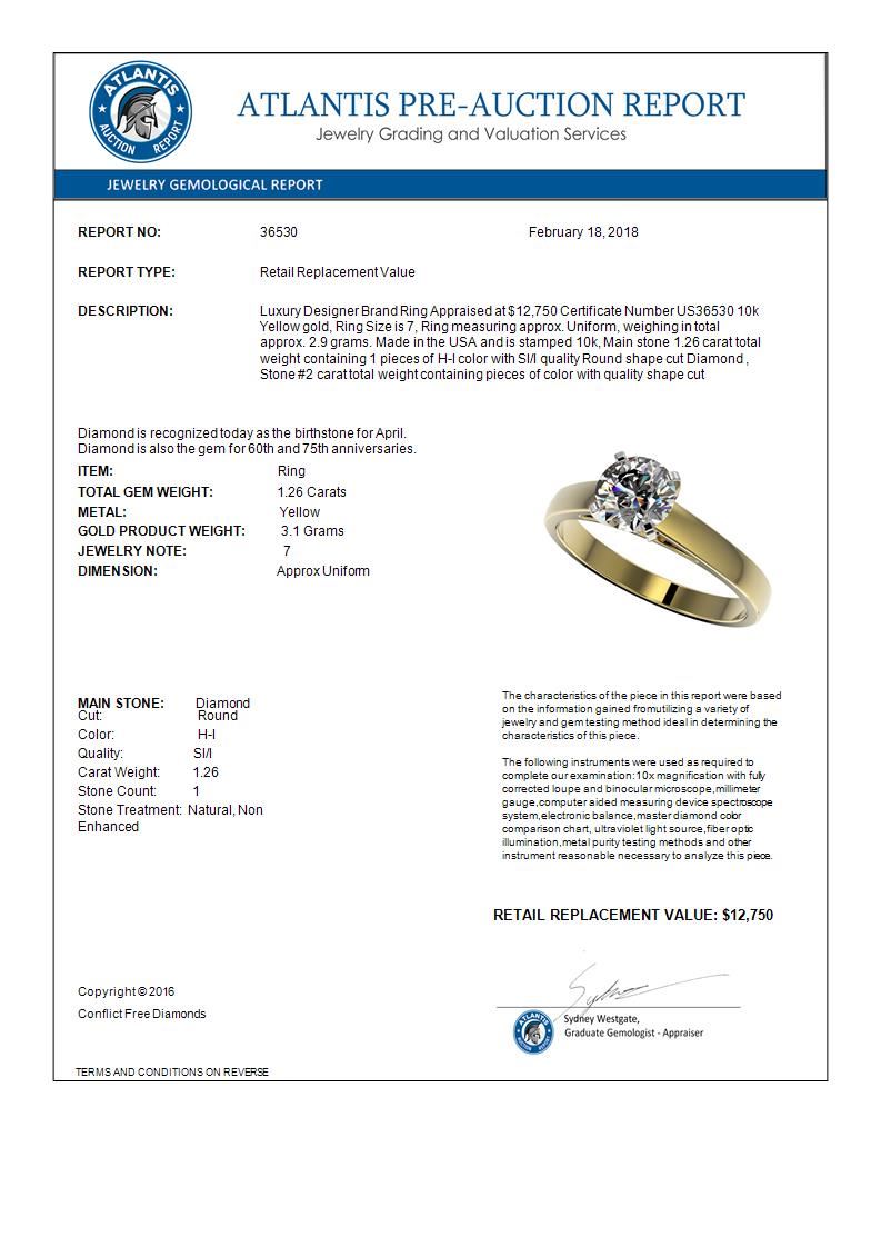REF-191K3W -36530 ---- 1.26 CTW Certified H-SI/I Quality Diamond Solitaire Engagement Ring 10K Yellow Gold ---- Luxury Designer Brand Ring Appraised at $12,750 Certificate Number US36530 10k Yellow gold, Ring Size is 7, Ring measuring approx. Uniform, weighing in total approx. 2.9 grams. Made in the USA and is stamped 10k, Main stone 1.26 carat total weight containing 1 pieces of H-I color with SI/I quality Round shape cut Diamond , Stone #2 carat total weight containing pieces of color with quality shape cut