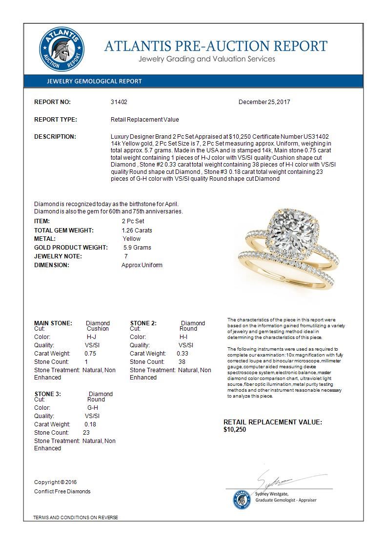 REF-233M5H -31402 ---- 1.26 CTW Certified VS/SI Cushion Diamond 2Pc Set Solitaire Halo 14K Yellow Gold ---- Luxury Designer Brand 2 Pc Set Appraised at $10,250 Certificate Number US31402 14k Yellow gold, 2 Pc Set Size is 7, 2 Pc Set measuring approx. Uniform, weighing in total approx. 5.7 grams. Made in the USA and is stamped 14k, Main stone 0.75 carat total weight containing 1 pieces of H-J color with VS/SI quality Cushion shape cut Diamond , Stone #2 0.33 carat total weight containing 38 pieces of H-I color with VS/SI quality Round shape cut Diamond , Stone #3 0.18 carat total weight containing 23 pieces of G-H color with VS/SI quality Round shape cut Diamond