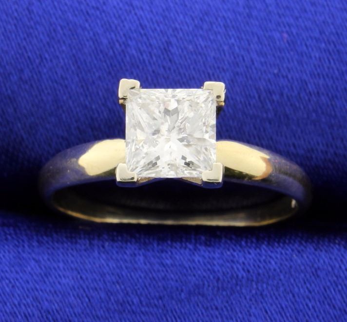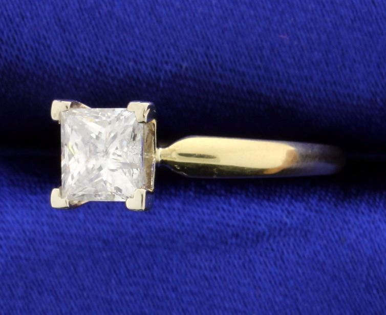 Gorgeous 1.26 carat diamond Princess cut solitaire. This princess cut is very white, G color, I1 clarity. Great look! Size 7 3/4 2.7g