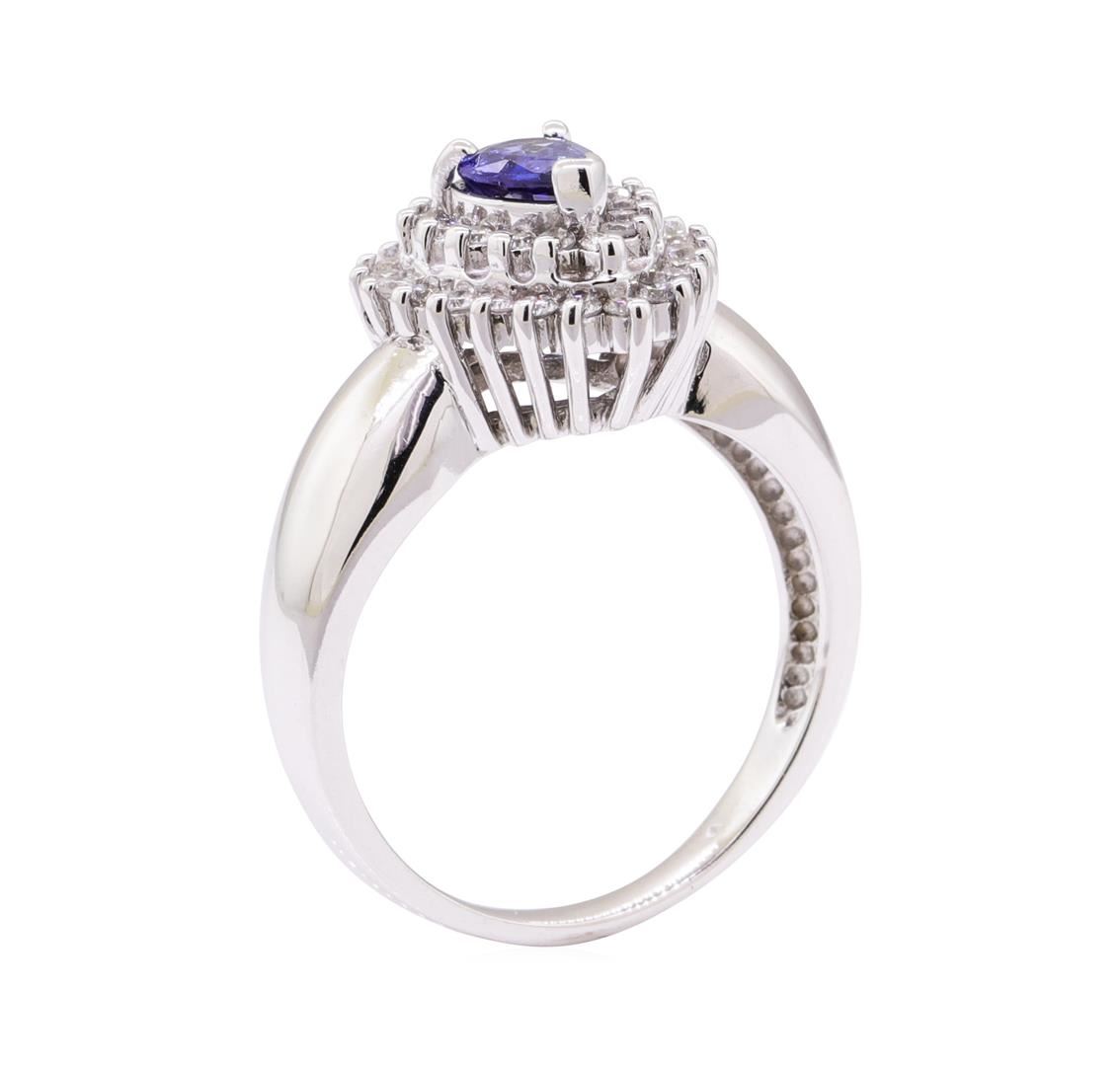 One cluster ring featuring: 14KT white gold weighing 6.6 grams containing one pear shaped blue sapphire weighing 0.66ct and diamonds weighing 0.60ctw. The ring has a double halo cluster motif.