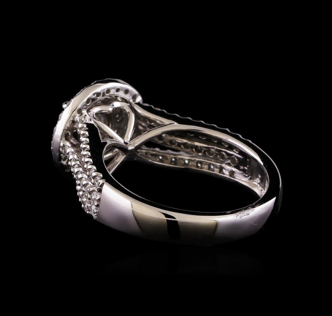 One electronically tested 14KT white gold lady's cast wedding ring with a split shank double halo with a bright polish finish. The featured lady's ring has a shank measuring 3.27 millimeters wide. Identified with markings of '585'. Condition is new, good workmanship. Containing: One prong set round brilliant cut diamond, measuring 5.18 - 5.13 x 3.10mm (depth est.) approximate weight of 0.50ct. Graded in the setting. Clarity SI-2. Color: G - H Cut Good Ten prong set round brilliant cut diamonds, measuring 1.75 - 1.65 x 1.04mm (depth est.) approximate total weight of 10 Stones = 0.18ct. Graded in the setting. Clarity SI-1 to SI-2. Color: H - I Cut Good Seventy-Five prong set round brilliant cut diamonds, measuring 1.30 - 1.25 x 0.79mm (depth est.) approximate total weight of 75 Stones = 0.58ct. Graded in the setting. Clarity SI-1 to I-1. Color: H - I Cut Good. Total Weight of Diamonds 1.26ct.. Total Weight of Ring 5.90gm. GAS Appraised at $6,705.00.