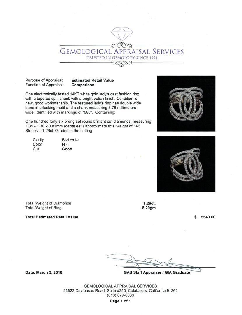 One electronically tested 14KT white gold lady's cast fashion ring with a tapered split shank with a bright polish finish. The featured lady's ring has double wide band interlocking motif and a shank measuring 5.78 millimeters wide. Identified with markings of "585". Condition is new, good workmanship. Containing: One Hundred Forty-Six prong set round brilliant cut diamonds, measuring 1.35 - 1.30 x 0.81mm (depth est.) approximate total weight of 146 Stones = 1.26ct. Graded in the setting. Clarity: SI-1 to I-1. Color: H - I. Cut Good. Total Weight of Diamonds 1.26ct. Total Weight of Ring 8.20gm. GAS Appraised.