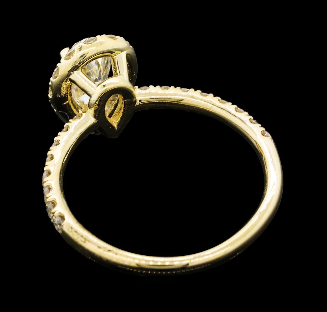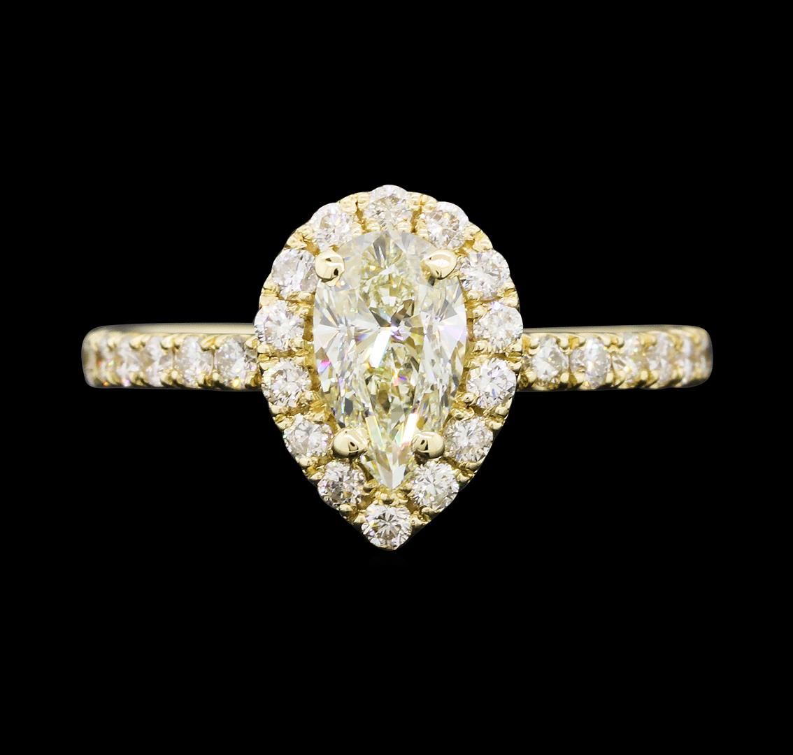 One electronically tested 14KT yellow gold lady's cast wedding ring with a basket halo with a bright polish finish. The featured lady's ring has a shank measuring 1.75 millimeters wide. Identified with markings of '14K'. Condition is new, good workmanship. Containing: One prong set pear shaped cut diamond, measuring 8.01 x 4.67 x 3.25mm (depth est.) , 10.00.%. GTCF approximate weight of 0.77ct. Graded in the setting. Color L - M Clarity VS-1 Cut Very Good Thirty prong set round brilliant cut diamonds, measuring 1.70 - 1.60 x 0.99mm (depth est.) approximate total weight of 30 Stones = 0.49ct. Graded in the setting. Color H - I Clarity VS-2 to SI-2 Cut Very Good. Total Weight of Diamonds 1.26ct.. Total Weight of Ring 2.60gm GAS Appraised at $5,905.00.