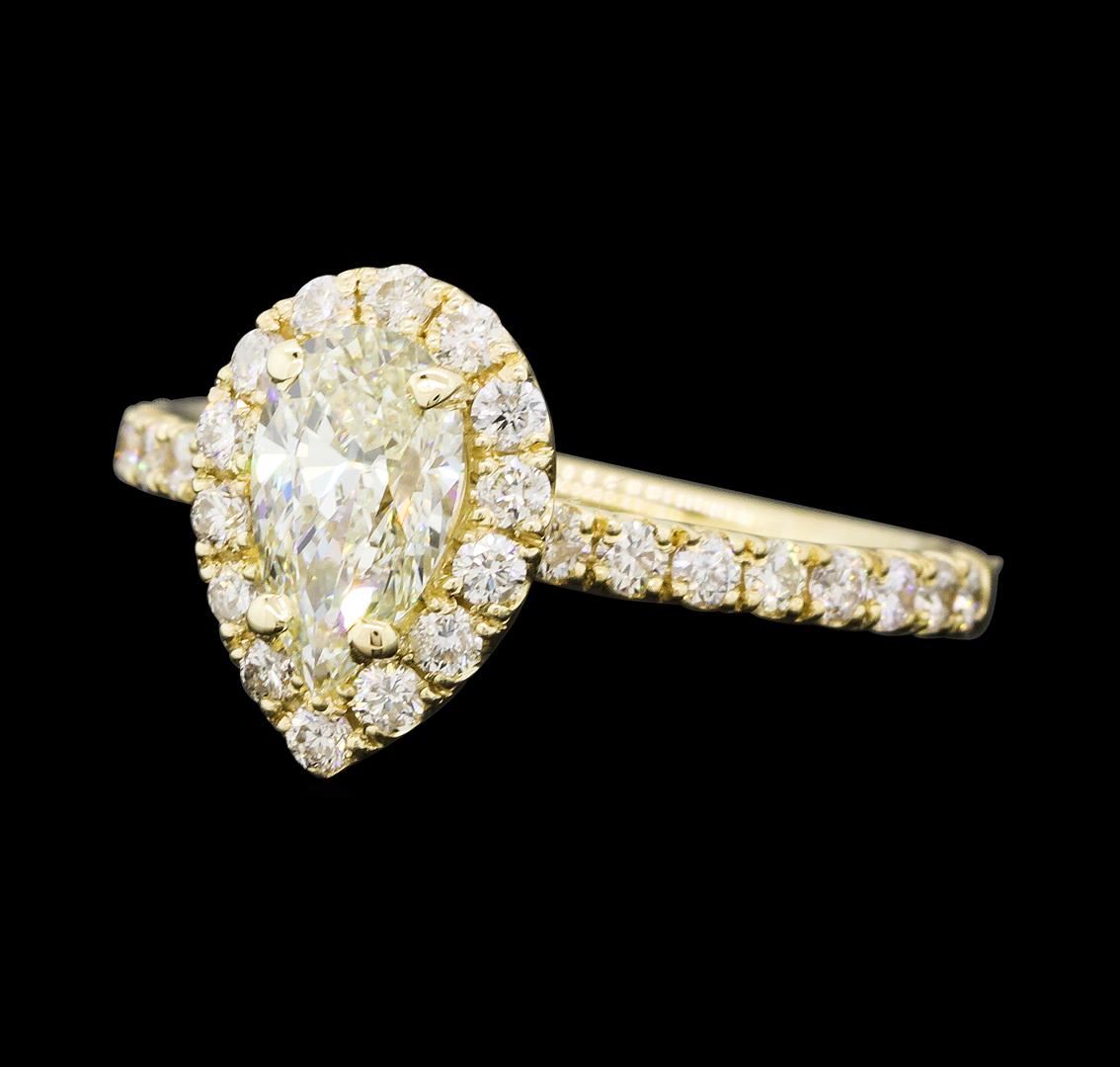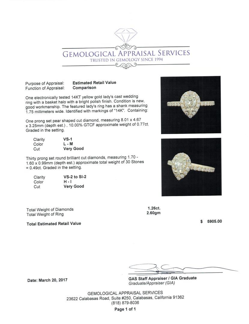 One electronically tested 14KT yellow gold lady's cast wedding ring with a basket halo with a bright polish finish. The featured lady's ring has a shank measuring 1.75 millimeters wide. Identified with markings of '14K'. Condition is new, good workmanship. Containing: One prong set pear shaped cut diamond, measuring 8.01 x 4.67 x 3.25mm (depth est.) , 10.00.%. GTCF approximate weight of 0.77ct. Graded in the setting. Color L - M Clarity VS-1 Cut Very Good Thirty prong set round brilliant cut diamonds, measuring 1.70 - 1.60 x 0.99mm (depth est.) approximate total weight of 30 Stones = 0.49ct. Graded in the setting. Color H - I Clarity VS-2 to SI-2 Cut Very Good. Total Weight of Diamonds 1.26ct.. Total Weight of Ring 2.60gm GAS Appraised at $5,905.00.