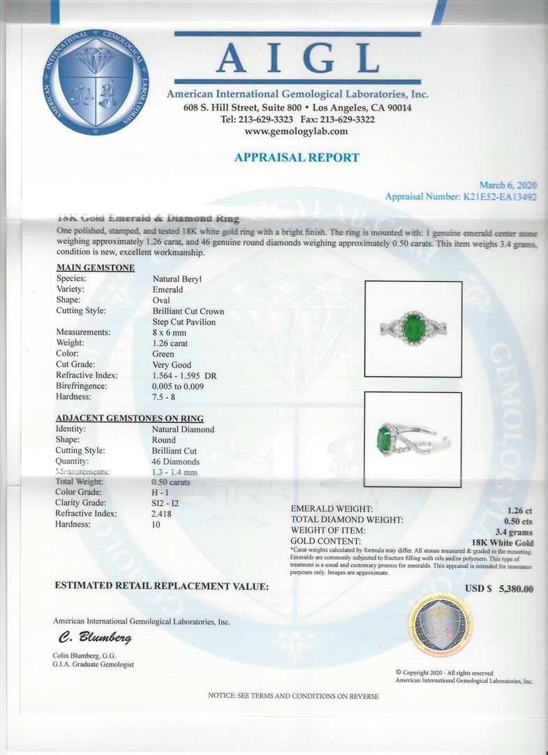 One 1.26ct Emerald and Diamond Ring - 18KT White Gold. AIG certified. See Appraisal for more details. AIG Appraised.