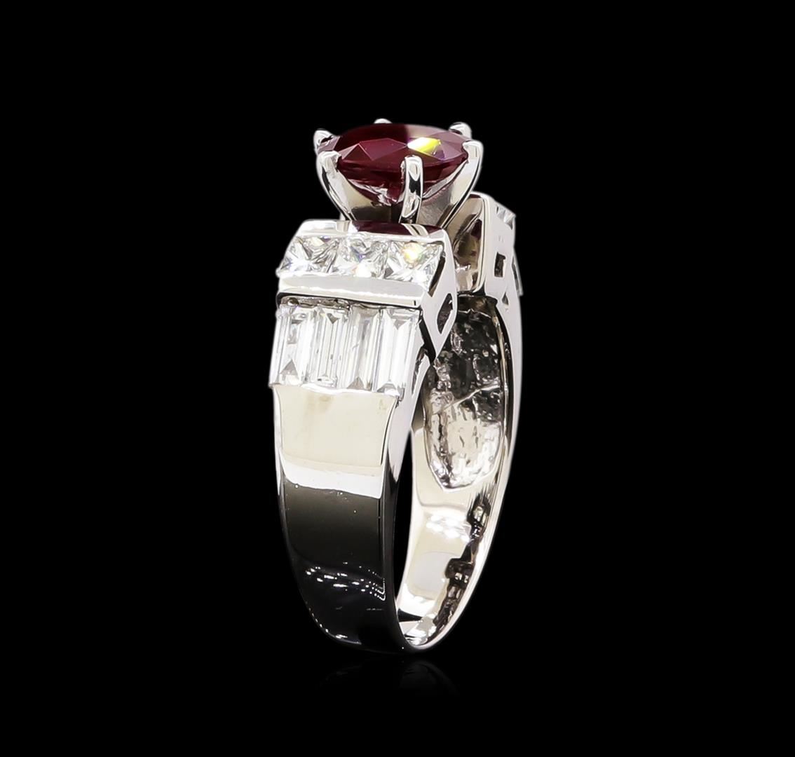 One electronically tested 14KT white gold ladies cast ruby and diamond ring with a bright polish finish. The featured ruby is supported by elaborate tapering diamond set shoulders, completed by a three millimeter wide band. Identified with markings of "14K". Condition is new, good workmanship. Containing: One prong set oval mixed cut natural ruby, measuring 7.40 x 6.60 x 2.90mm, 6%. bulge factor, approximate weight of 1.26ct., clarity is heavily included, type II, dark, very slightly brownish, red color, (GIA R 7/3), cut is good. Transmitting light somewhat diffusely, transparent to translucent. Naturally occurring internal & external characteristics are present. Graded in the setting. Six channel set princess cut diamonds, measuring 2.90 x 2.60 x 1.95mm (depth est.) approximate total weight of 6 Stones = 0.83ct. Graded in the setting. Clarity: SI-1 to SI-2. Color: H - I Eight channel set baguette cut diamonds, measuring from 0.00 x 0.00 x 1.19mm (depth est.) to 4.50 x 1.90 x 0.00mm (depth est.) approximate total weight of 8 Stones = 0.73ct. Graded in the setting. Clarity: SI-1 to SI-2. Color: G - H. Total Weight of Colored Stones 1.26ct. Total Weight of Diamonds 1.56ct. Total Weight of Ring 6.50gm. AIG Appraised at $7,280.00.