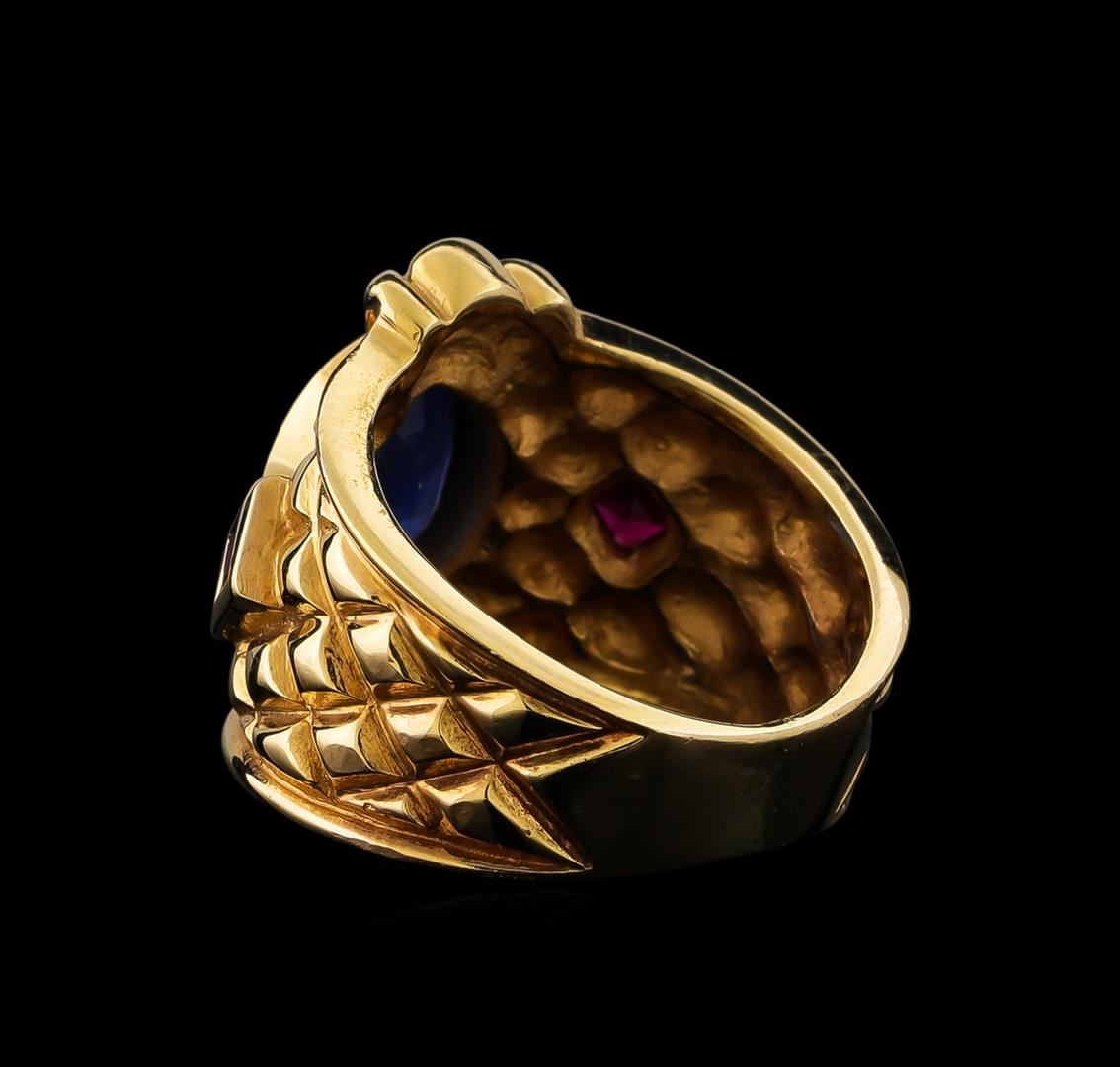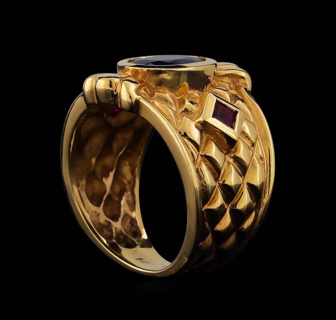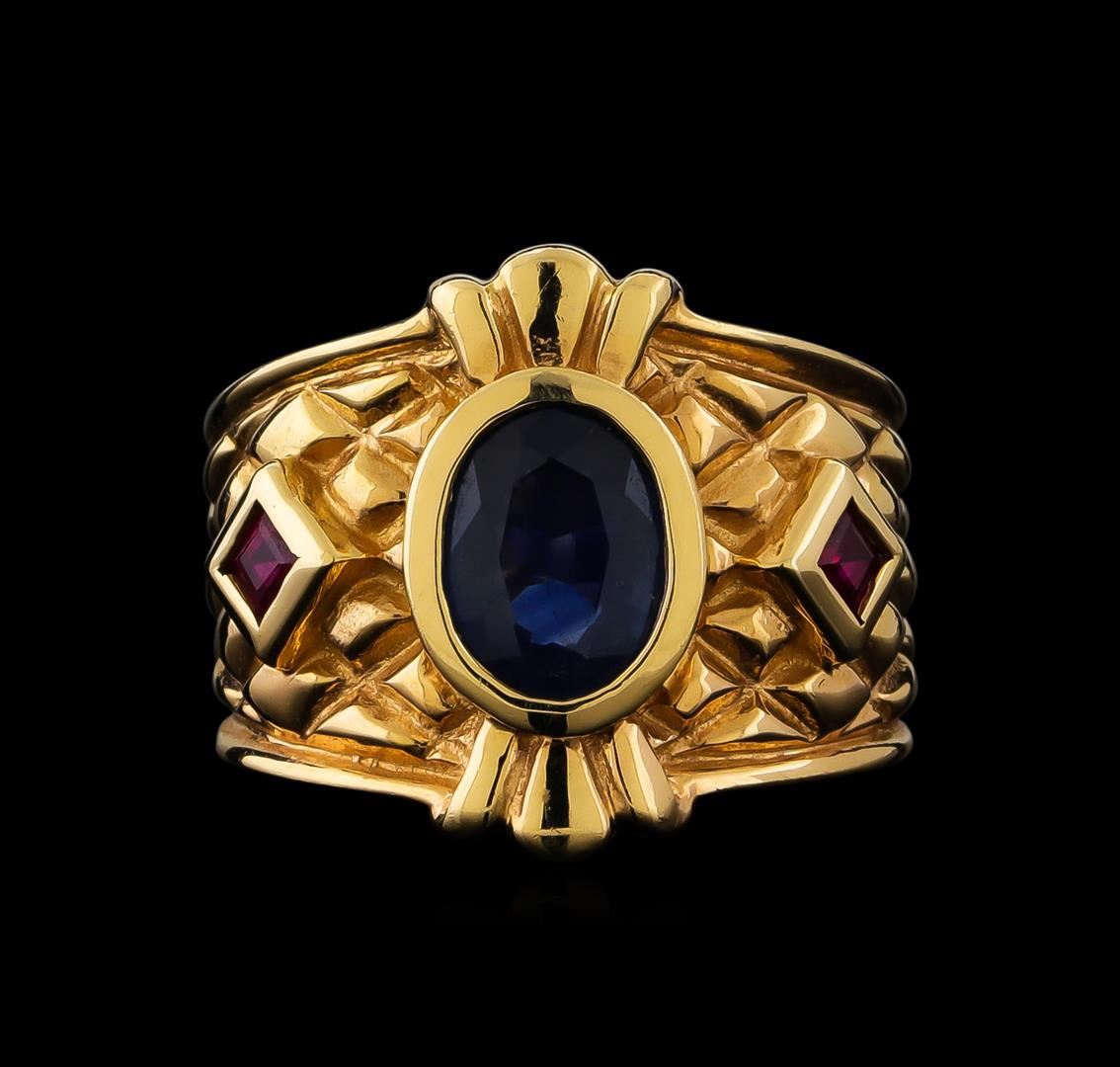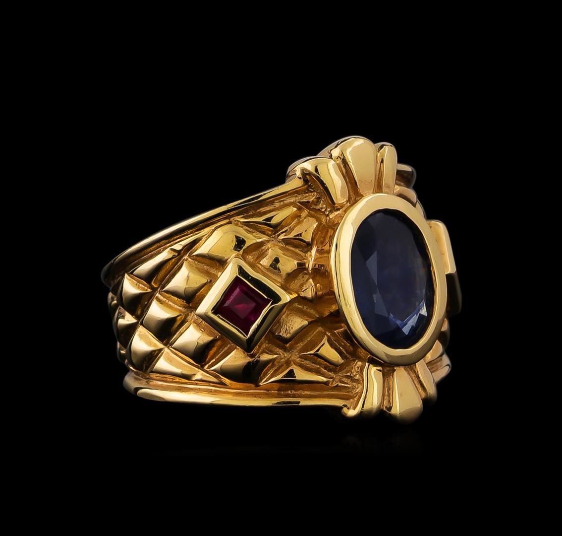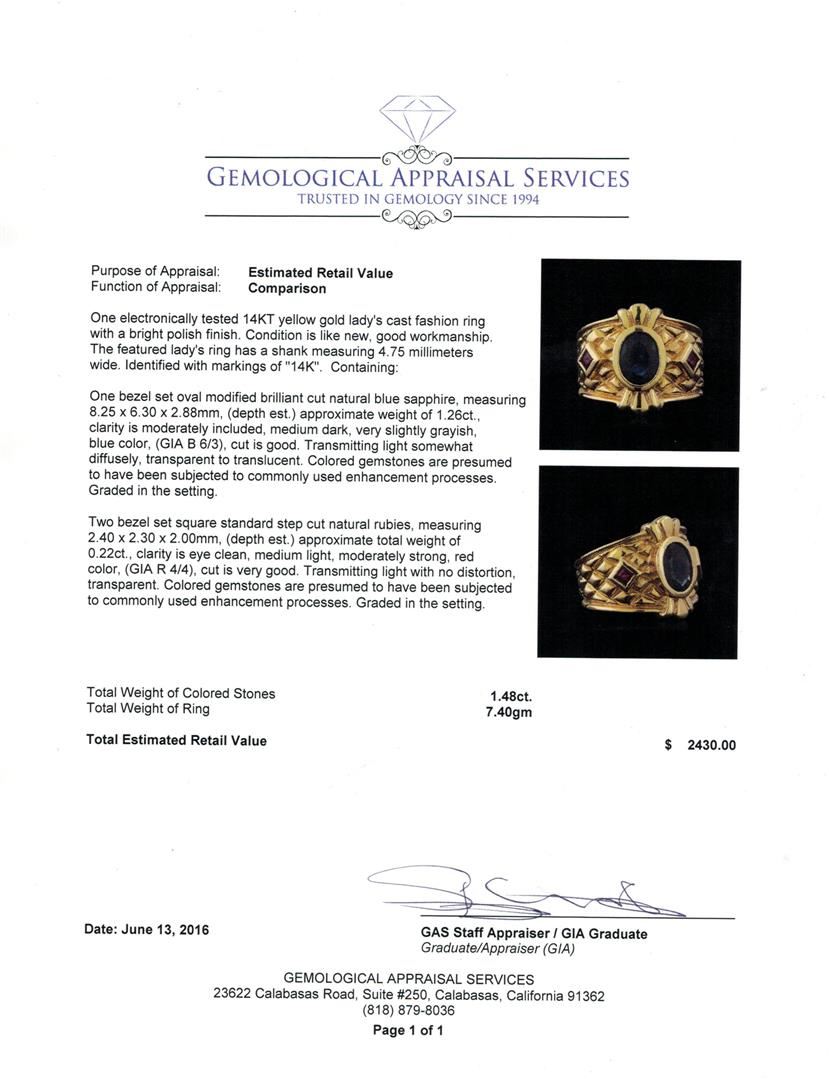 One electronically tested 14KT yellow gold lady's cast fashion ring with a bright polish finish. The featured lady's ring has a shank measuring 4.75 millimeters wide. Identified with markings of "14K". Condition is like new, good workmanship. Containing: One bezel set oval modified brilliant cut natural blue sapphire, measuring 8.25 x 6.30 x 2.88mm, (depth est.) approximate weight of 1.26ct., clarity is moderately included, medium dark, very slightly grayish, blue color, (GIA B 6/3), cut is good. Transmitting light somewhat diffusely, transparent to translucent. Colored gemstones are presumed to have been subjected to commonly used enhancement processes. Graded in the setting. Two bezel set square standard step cut natural rubies, measuring 2.40 x 2.30 x 2.00mm, (depth est.) approximate total weight of 0.22ct., clarity is eye clean, medium light, moderately strong, red color, (GIA R 4/4), cut is very good. Transmitting light with no distortion, transparent. Colored gemstones are presumed to have been subjected to commonly used enhancement processes. Graded in the setting. Total Weight of Colored Stones 1.48ct. Total Weight of Ring 7.40gm. GAS Appraised at $2,430.00.