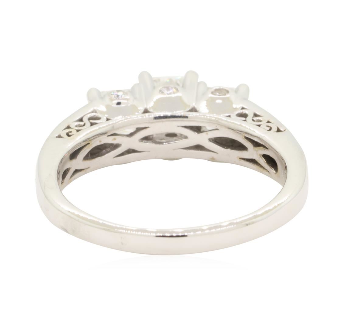 One electronically tested 14KT white gold lady's combination cast & assembled wedding ring with a three stone cathedral shank with a bright polish finish. This featured lady's ring has a shank measuring 2.15 millimeters in width. Identified with markings of '14K'. Condition is new, good workmanship. Containing: Three prong set princess cut diamonds, measuring 4.30 x 4.00 x 3.00mm (depth est.) approximate total weight of 3 Stones = 1.27ct. Graded in the setting. Color G - H Clarity SI-2 to I-1 Cut Very Good Six bezel set round brilliant cut diamonds, measuring 1.70 - 1.60 x 1.02mm (depth est.) approximate total weight of 6 Stones = 0.10ct. Graded in the setting. Color G - H Clarity SI-1 to SI-2 Cut Very Good Twelve channel set baguette cut diamonds, measuring from 2.25 x 1.25 x 1.06mm (depth est.) to 2.60 x 1.40 x 1.19mm (depth est.) approximate total weight of 12 Stones = 0.40ct. Diamond has very small chip. Graded in the setting. Color G - H Clarity VS-1 to VS-2 Cut Good. Total Weight of Diamonds 1.77ct.. Total Weight of Ring 5.40gm GAS Appraised at $4700.00. GAS Appraised.