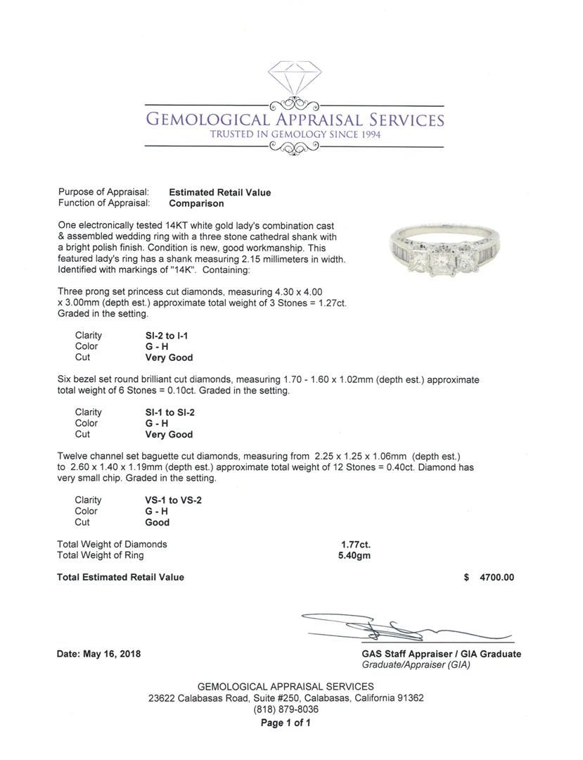 One electronically tested 14KT white gold lady's combination cast & assembled wedding ring with a three stone cathedral shank with a bright polish finish. This featured lady's ring has a shank measuring 2.15 millimeters in width. Identified with markings of '14K'. Condition is new, good workmanship. Containing: Three prong set princess cut diamonds, measuring 4.30 x 4.00 x 3.00mm (depth est.) approximate total weight of 3 Stones = 1.27ct. Graded in the setting. Color G - H Clarity SI-2 to I-1 Cut Very Good Six bezel set round brilliant cut diamonds, measuring 1.70 - 1.60 x 1.02mm (depth est.) approximate total weight of 6 Stones = 0.10ct. Graded in the setting. Color G - H Clarity SI-1 to SI-2 Cut Very Good Twelve channel set baguette cut diamonds, measuring from 2.25 x 1.25 x 1.06mm (depth est.) to 2.60 x 1.40 x 1.19mm (depth est.) approximate total weight of 12 Stones = 0.40ct. Diamond has very small chip. Graded in the setting. Color G - H Clarity VS-1 to VS-2 Cut Good. Total Weight of Diamonds 1.77ct.. Total Weight of Ring 5.40gm GAS Appraised at $4700.00. GAS Appraised.