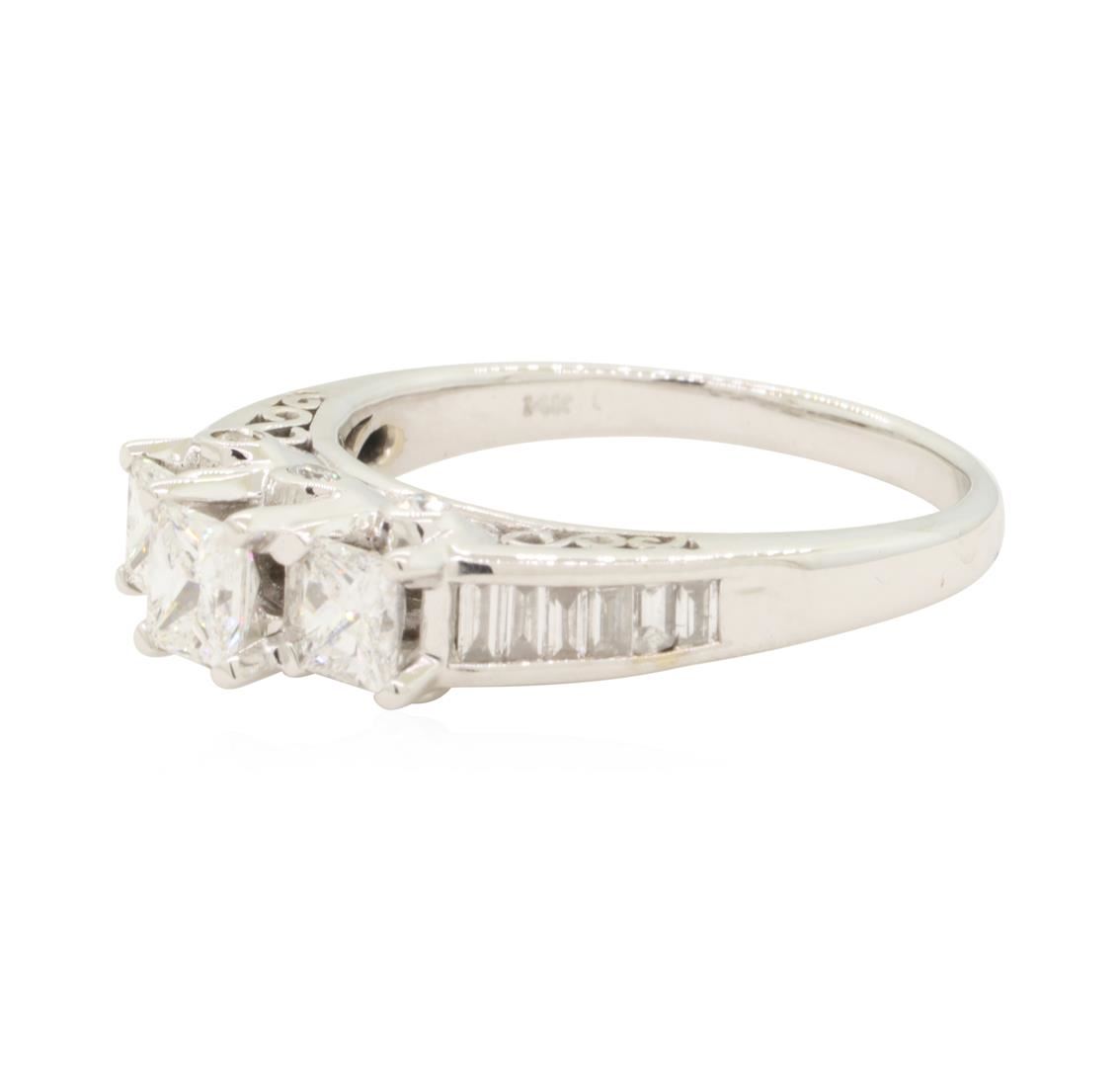 One electronically tested 14KT white gold lady's combination cast & assembled wedding ring with a three stone cathedral shank with a bright polish finish. This featured lady's ring has a shank measuring 2.15 millimeters in width. Identified with markings of '14K'. Condition is new, good workmanship. Containing: Three prong set princess cut diamonds, measuring 4.30 x 4.00 x 3.00mm (depth est.) approximate total weight of 3 Stones = 1.27ct. Graded in the setting. Color G - H Clarity SI-2 to I-1 Cut Very Good Six bezel set round brilliant cut diamonds, measuring 1.70 - 1.60 x 1.02mm (depth est.) approximate total weight of 6 Stones = 0.10ct. Graded in the setting. Color G - H Clarity SI-1 to SI-2 Cut Very Good Twelve channel set baguette cut diamonds, measuring from 2.25 x 1.25 x 1.06mm (depth est.) to 2.60 x 1.40 x 1.19mm (depth est.) approximate total weight of 12 Stones = 0.40ct. Diamond has very small chip. Graded in the setting. Color G - H Clarity VS-1 to VS-2 Cut Good. Total Weight of Diamonds 1.77ct.. Total Weight of Ring 5.40gm GAS Appraised at $4700.00. GAS Appraised.
