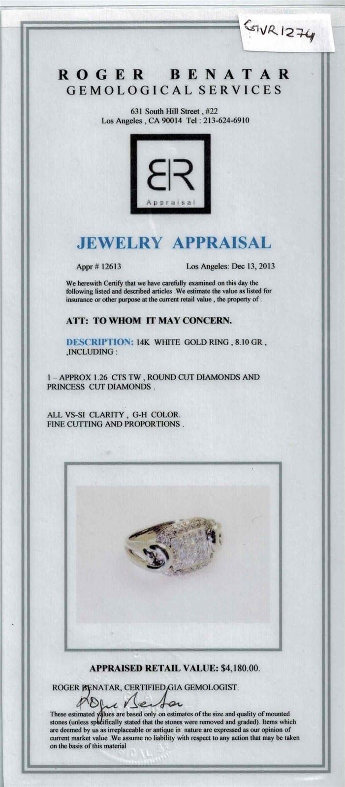 14K WHITE GOLD NATURAL DIAMOND RING :8.10GRAM / DIAMOND:1.26CT APPROX/#GVR1274 **This handsome ring features glittering 1.26ct round and princess cut Diamonds, which carry a high frequency of energy to stimulate and open all of the chakras. Warmly crafted in 14K white gold, it is sure to evoke thoughts of power and glamour.**