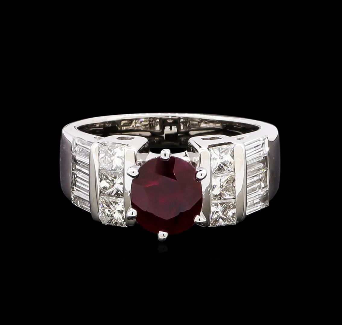 One electronically tested 14KT white gold ladies cast ruby and diamond ring with a bright polish finish. The featured ruby is supported by elaborate tapering diamond set shoulders, completed by a three millimeter wide band. Identified with markings of "14K". Condition is new, good workmanship. Containing: One prong set oval mixed cut natural ruby, measuring 7.40 x 6.60 x 2.90mm, 6%. bulge factor, approximate weight of 1.26ct., clarity is heavily included, type II, dark, very slightly brownish, red color, (GIA R 7/3), cut is good. Transmitting light somewhat diffusely, transparent to translucent. Naturally occurring internal & external characteristics are present. Graded in the setting. Six channel set princess cut diamonds, measuring 2.90 x 2.60 x 1.95mm (depth est.) approximate total weight of 6 Stones = 0.83ct. Graded in the setting. Clarity: SI-1 to SI-2. Color: H - I Eight channel set baguette cut diamonds, measuring from 0.00 x 0.00 x 1.19mm (depth est.) to 4.50 x 1.90 x 0.00mm (depth est.) approximate total weight of 8 Stones = 0.73ct. Graded in the setting. Clarity: SI-1 to SI-2. Color: G - H. Total Weight of Colored Stones 1.26ct. Total Weight of Diamonds 1.56ct. Total Weight of Ring 6.50gm. AIG Appraised at $7,280.00.