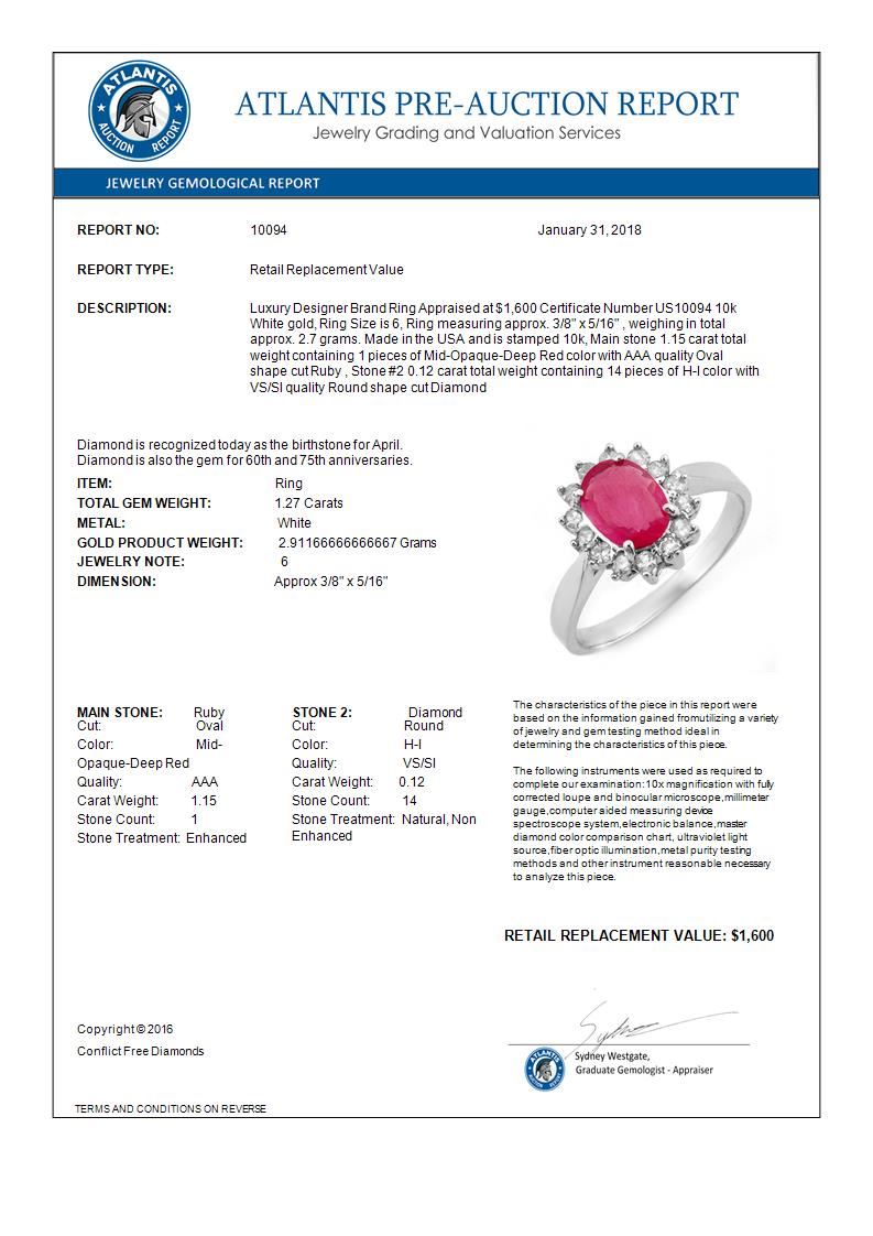 REF-24H5A -10094 ---- 1.27 CTW Ruby & Diamond Ring 10K White Gold ---- Luxury Designer Brand Ring Appraised at $1,600 Certificate Number US10094 10k White gold, Ring Size is 6, Ring measuring approx. 3/8" x 5/16" , weighing in total approx. 2.7 grams. Made in the USA and is stamped 10k, Main stone 1.15 carat total weight containing 1 pieces of Mid-Opaque-Deep Red color with AAA quality Oval shape cut Ruby , Stone #2 0.12 carat total weight containing 14 pieces of H-I color with VS/SI quality Round shape cut Diamond