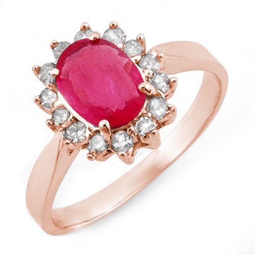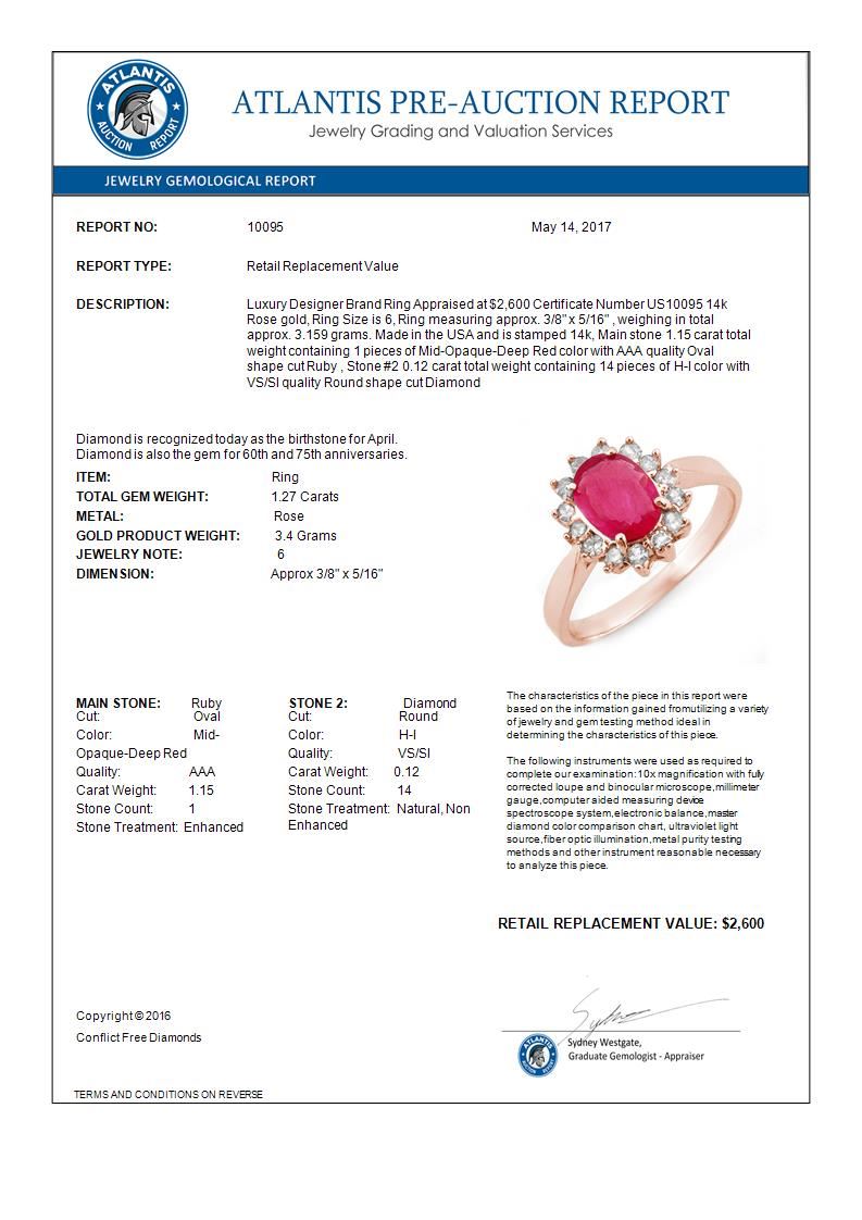 1.27 CTW Ruby & Diamond Ring 14K Rose Gold ---- Luxury Designer Brand Ring Appraised Retail Price at $2,600 ---- SKU Number US10095 14k Rose gold Ring Size is 6, Ring measuring approx. 3/8" x 5/16" , weighing in total approx. 3.159 grams. Made in the USA and is stamped 14k, Main stone 1.15 carat total weight containing 1 pieces of Mid-Opaque-Deep Red color with AAA quality Oval shape cut Ruby , Stone #2 0.12 carat total weight containing 14 pieces of H-I color with VS/SI quality Round shape cut