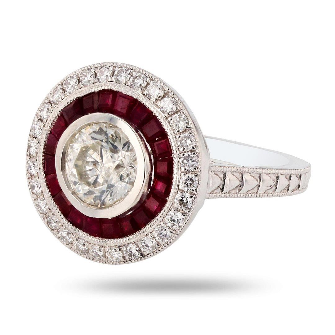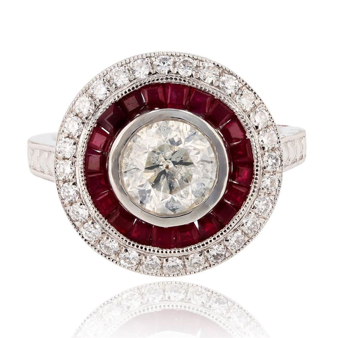 1.27ct CENTER Diamond and 1.26ctw Ruby Platinum Ring (1.65ctw Diamonds). Platinum Diamond & Ruby Ring One polished, stamped, and tested platinum ring with a bright finish. The ring is mounted with 1 genuine diamond center stone weighing approximately 1.27 carat, 20 genuine faceted rubies weighing approximately 1.26 carats, and 28 genuine round diamonds weighing approximately 0.38 carats. This item weighs 11.7 grams, condition is new, excellent workmanship. MAIN GEMSTONE Identity: Natural Diamond Shape: Round Cutting Style: Brilliant Cut Average Diameter: 7mm Weight: 1.27 carat Color Grade: I Clarity Grade: I1 Polish: Very Good Symmetry: Very Good Refractive Index: 2.417 Hardness: 10 ADJACENT GEMSTONES ON RING Species: Natural Corundum Variety: Ruby Shape: Square Cutting Style: Step Cut Quantity: 20 Rubies Average Dimensions: 1.8mm Total Weight: 1.26 carats Color: Red Refractive Index: 1.762 - 1.770 DR Birefringence: 0.008 - 0.010 Hardness: 9 ADJACENT GEMSTONES ON RING Identity: Natural Diamond Shape: Round Cutting Style: Brilliant Cut Quantity: 28 Diamonds Average Diameter: 1.4mm Total Weight: 0.38 carats Color Grade: F - G Clarity Grade: SI1 to SI2 Refractive Index: 2.418 Hardness: 10 CENTER DIAMOND WEIGHT: 1.27ct TOTAL RUBY WEIGHT: 1.26ctw TOTAL DIAMOND WEIGHT: 1.65ctw WEIGHT OF ITEM: 11.7 grams METAL: Platinum