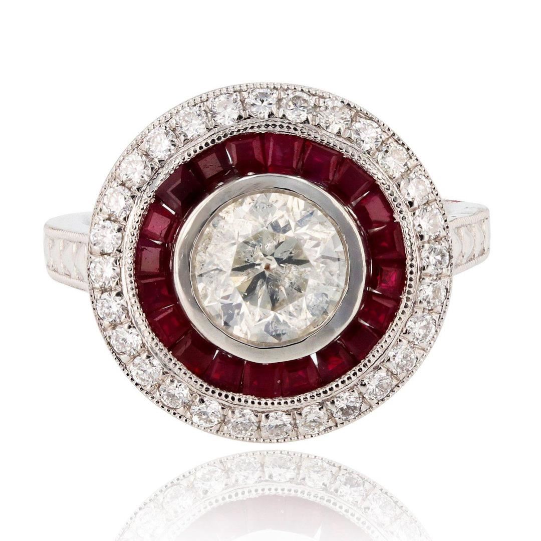 Platinum Diamond & Ruby Ring One polished, stamped, and tested platinum ring with a bright finish. The ring is mounted with 1 genuine diamond center stone weighing approximately 1.27 carat, 20 genuine faceted rubies weighing approximately 1.26 carats, an