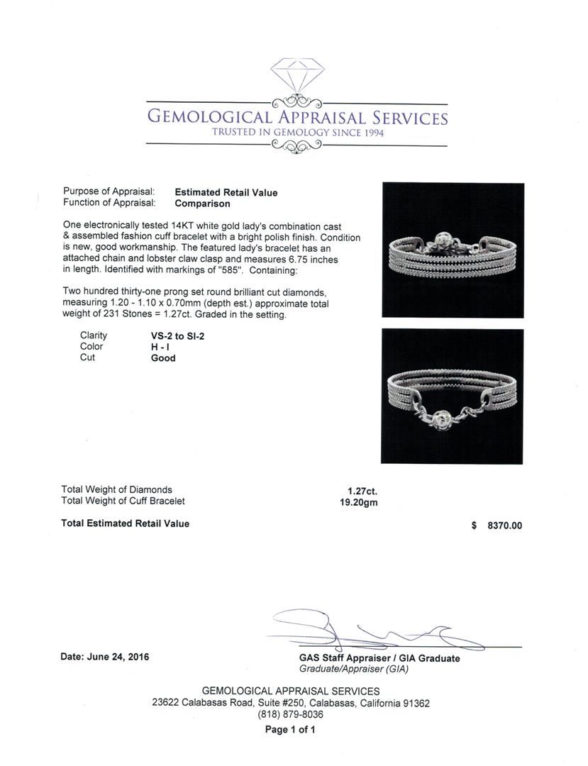 One electronically tested 14KT white gold lady's combination cast & assembled fashion cuff bracelet with a bright polish finish. The featured lady's bracelet has an attached chain and lobster claw clasp and measures 6.75 inches in length. Identified with markings of "585". Condition is new, good workmanship. Containing: Two Hundred Thirty-One prong set round brilliant cut diamonds, measuring 1.20 - 1.10 x 0.70mm (depth est.) approximate total weight of 231 Stones = 1.27ct. Graded in the setting. Clarity: VS-2 to SI-2. Color: H - I. Cut Good. Total Weight of Diamonds 1.27ct. Total Weight of Cuff Bracelet 19.20gm. GAS Appraised at $8,370.00.