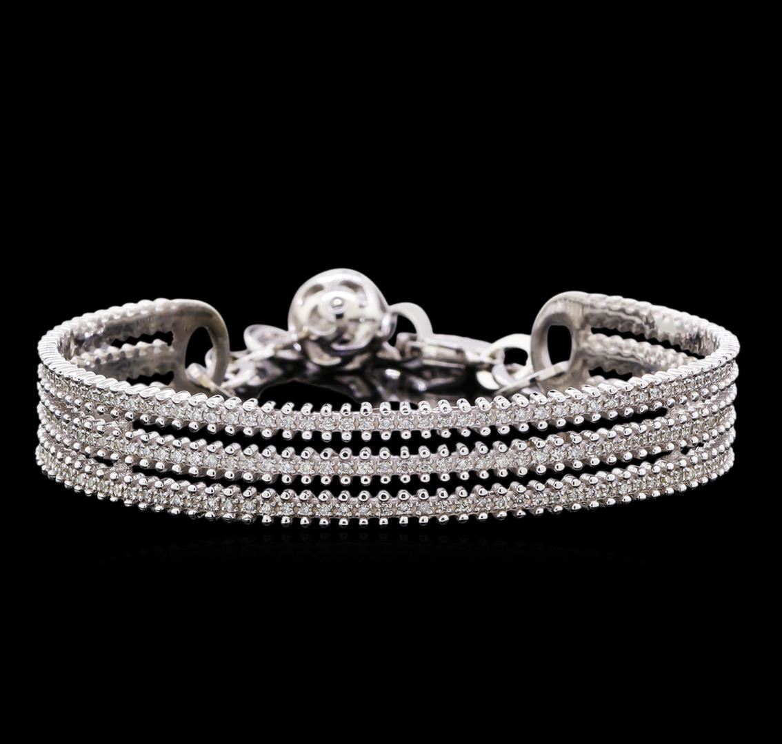 One electronically tested 14KT white gold lady's combination cast & assembled fashion cuff bracelet with a bright polish finish. The featured lady's bracelet has an attached chain and lobster claw clasp and measures 6.75 inches in length. Identified with markings of "585". Condition is new, good workmanship. Containing: Two Hundred Thirty-One prong set round brilliant cut diamonds, measuring 1.20 - 1.10 x 0.70mm (depth est.) approximate total weight of 231 Stones = 1.27ct. Graded in the setting. Clarity: VS-2 to SI-2. Color: H - I. Cut Good. Total Weight of Diamonds 1.27ct. Total Weight of Cuff Bracelet 19.20gm. GAS Appraised at $8,370.00.