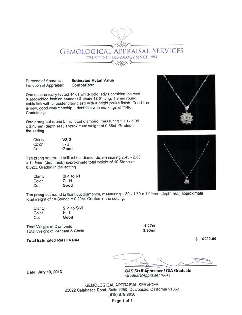 One electronically tested 14KT white gold lady's combination cast & assembled fashion pendant & chain 18.0' long, 1.3mm round cable link with a lobster claw clasp with a bright polish finish. Identified with markings of '14K'. Condition is new, good workmanship. Containing: One prong set round brilliant cut diamond, measuring 5.10 - 5.05 x 3.40mm (depth est.) approximate weight of 0.55ct. Graded in the setting. Clarity VS-2. Color: I - J Cut Good Ten prong set round brilliant cut diamonds, measuring 2.45 - 2.35 x 1.49mm (depth est.) approximate total weight of 10 Stones = 0.52ct. Graded in the setting. Clarity SI-1 to I-1. Color: G - H Cut Good Ten prong set round brilliant cut diamonds, measuring 1.80 - 1.70 x 1.09mm (depth est.) approximate total weight of 10 Stones = 0.20ct. Graded in the setting. Clarity SI-1 to SI-2. Color: H - I Cut Good. Total Weight of Diamonds 1.27ct.. Total Weight of Pendant & Chain 3.90gm. GAS Appraised at $6,230.00.