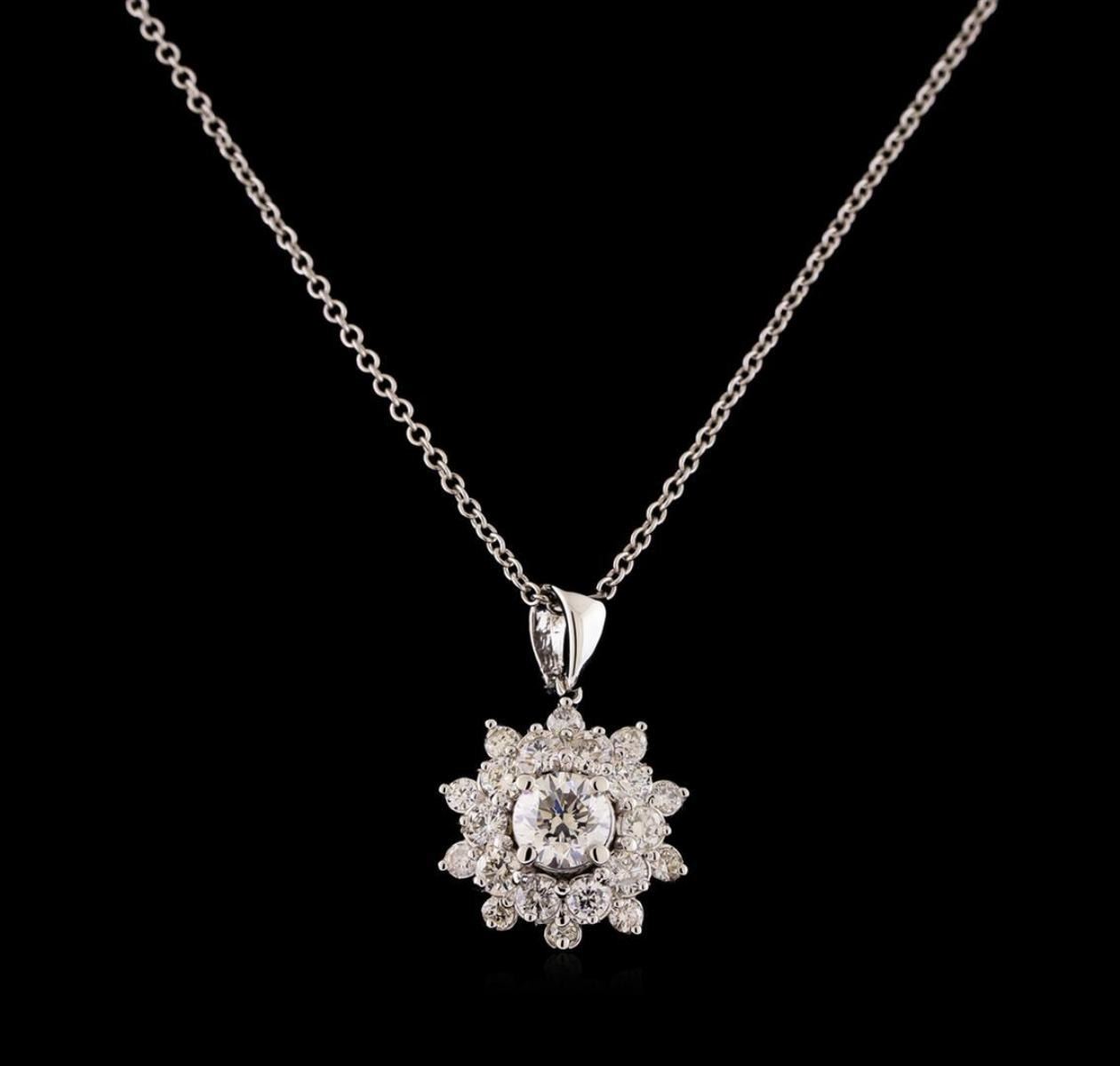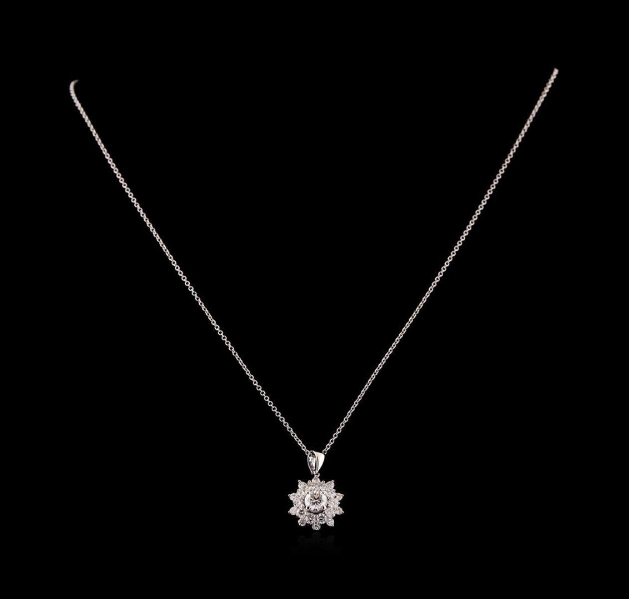 One electronically tested 14KT white gold lady's combination cast & assembled fashion pendant & chain 18.0' long, 1.3mm round cable link with a lobster claw clasp with a bright polish finish. Identified with markings of '14K'. Condition is new, good workmanship. Containing: One prong set round brilliant cut diamond, measuring 5.10 - 5.05 x 3.40mm (depth est.) approximate weight of 0.55ct. Graded in the setting. Clarity VS-2. Color: I - J Cut Good Ten prong set round brilliant cut diamonds, measuring 2.45 - 2.35 x 1.49mm (depth est.) approximate total weight of 10 Stones = 0.52ct. Graded in the setting. Clarity SI-1 to I-1. Color: G - H Cut Good Ten prong set round brilliant cut diamonds, measuring 1.80 - 1.70 x 1.09mm (depth est.) approximate total weight of 10 Stones = 0.20ct. Graded in the setting. Clarity SI-1 to SI-2. Color: H - I Cut Good. Total Weight of Diamonds 1.27ct.. Total Weight of Pendant & Chain 3.90gm. GAS Appraised.
