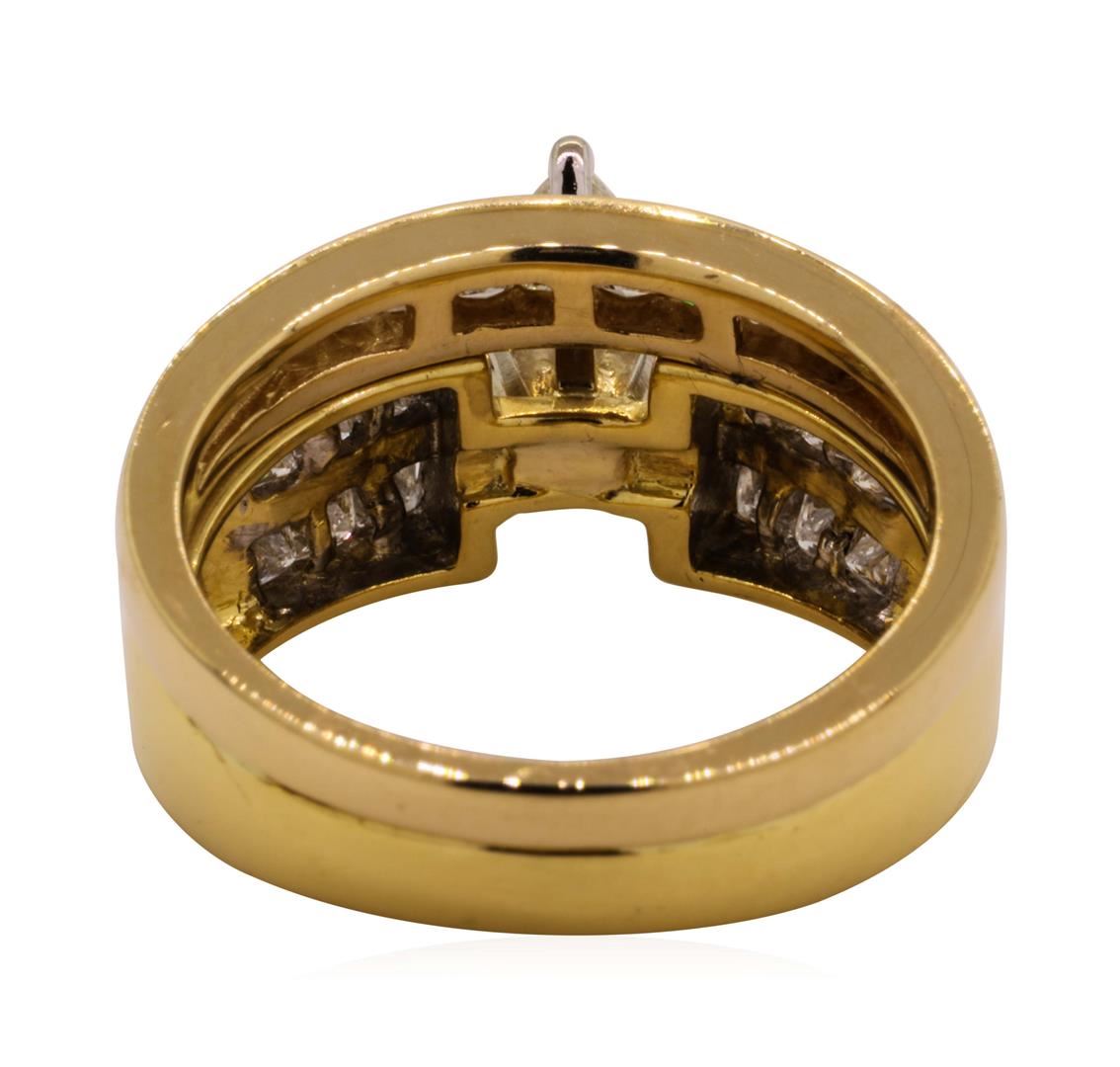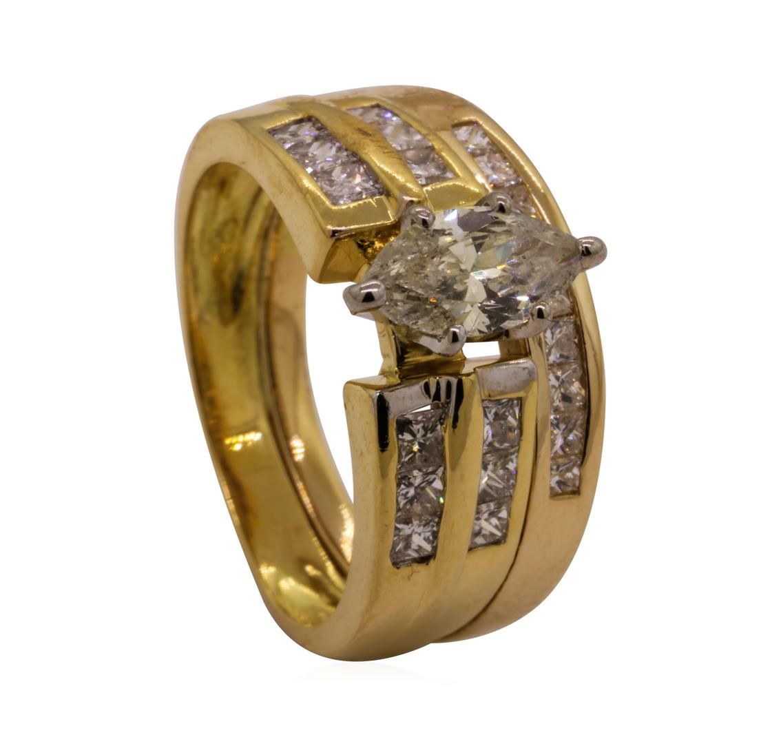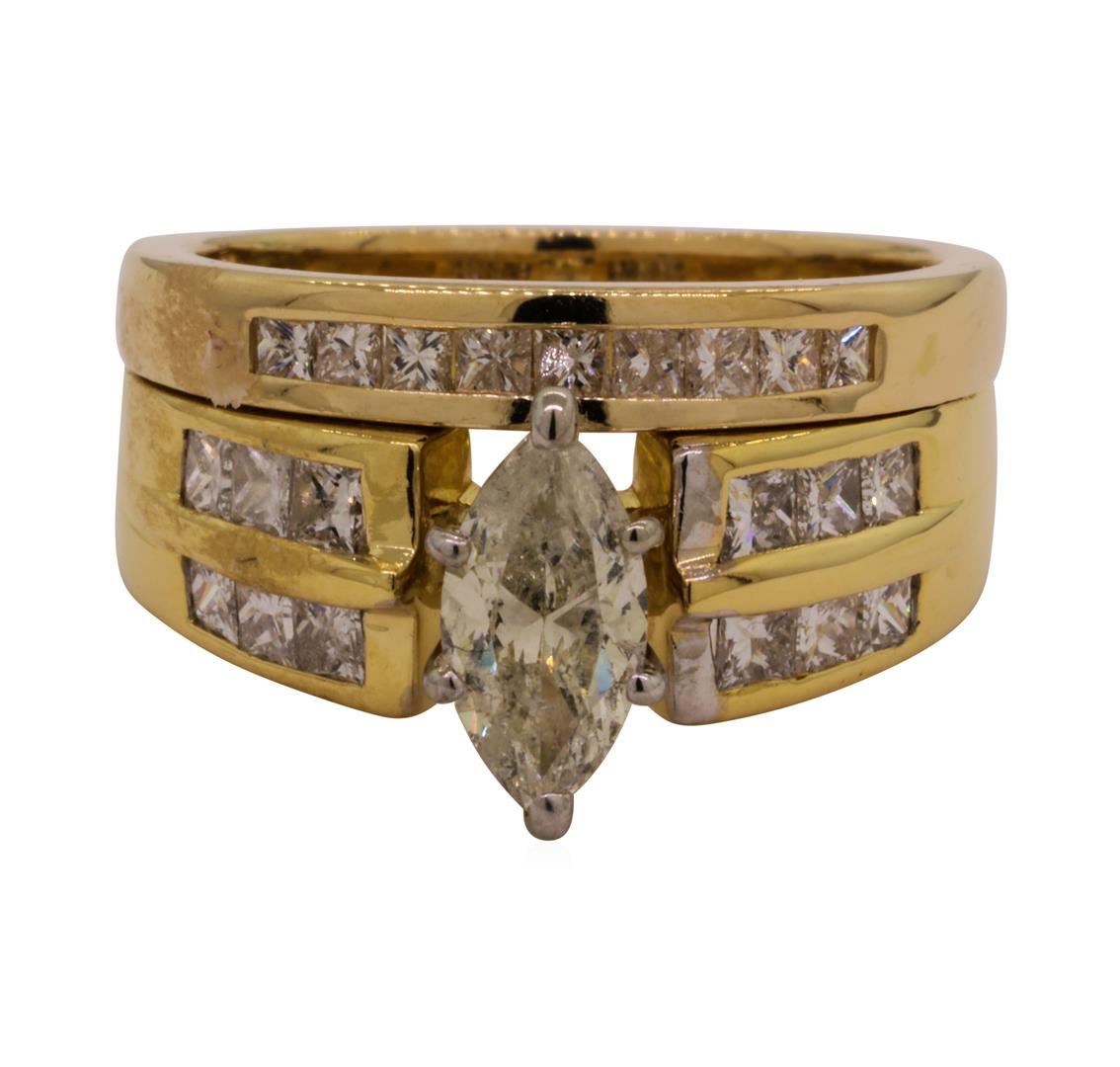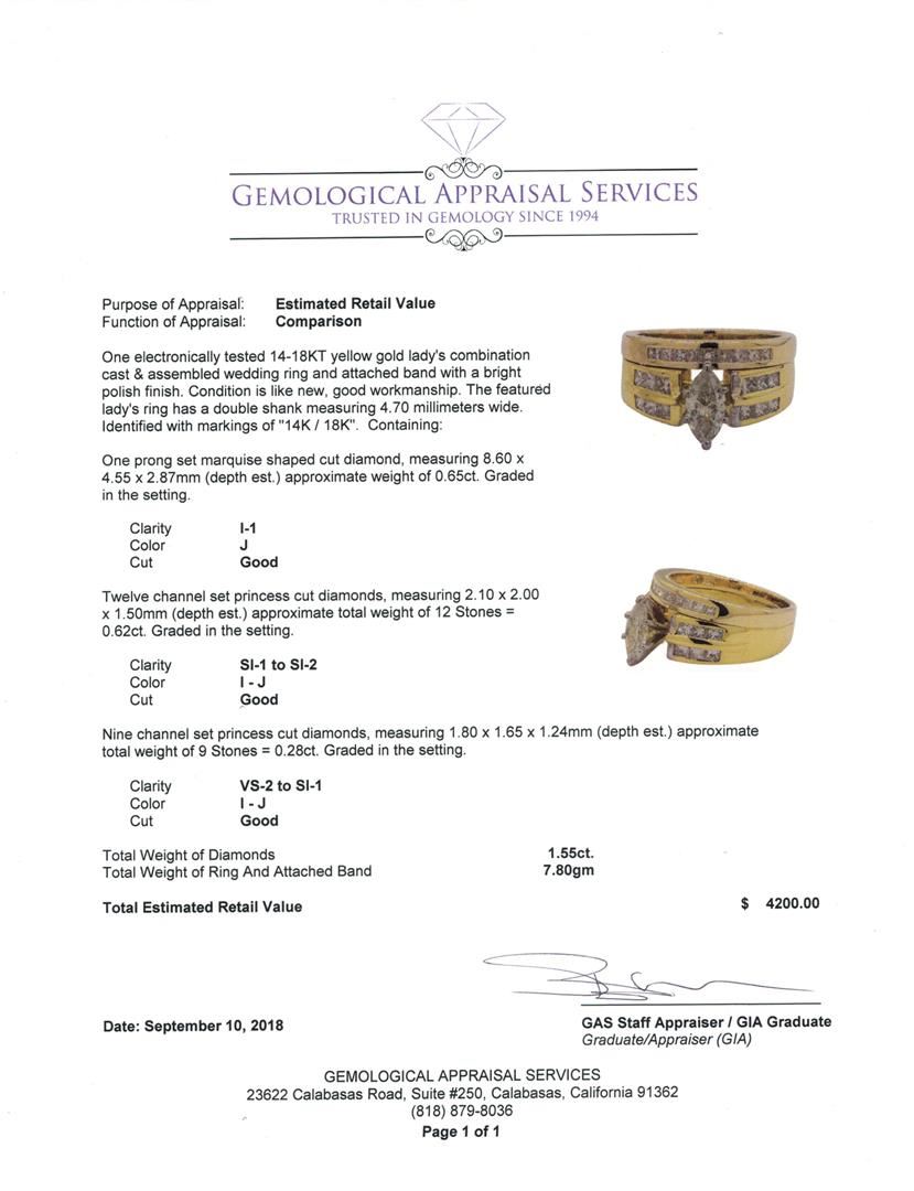 One electronically tested 14-18KT yellow gold lady's combination cast & assembled wedding ring and attached band with a bright polish finish. The featured lady's ring has a double shank measuring 4.70 millimeters wide. Identified with markings of '14K / 18K'. Condition is like new, good workmanship. Containing: One prong set marquise shaped cut diamond, measuring 8.60 x 4.55 x 2.87mm (depth est.) approximate weight of 0.65ct. Graded in the setting. Color J Clarity I-1 Cut Good Twelve channel set princess cut diamonds, measuring 2.10 x 2.00 x 1.50mm (depth est.) approximate total weight of 12 Stones = 0.62ct. Graded in the setting. Color I - J Clarity SI-1 to SI-2 Cut Good Nine channel set princess cut diamonds, measuring 1.80 x 1.65 x 1.24mm (depth est.) approximate total weight of 9 Stones = 0.28ct. Graded in the setting. Color I - J Clarity VS-2 to SI-1 Cut Good. Total Weight of Diamonds 1.55ct.. Total Weight of Ring And Attached Band 7.80gm GAS Appraised at $4200.00. GAS Appraised at $4,200.00.