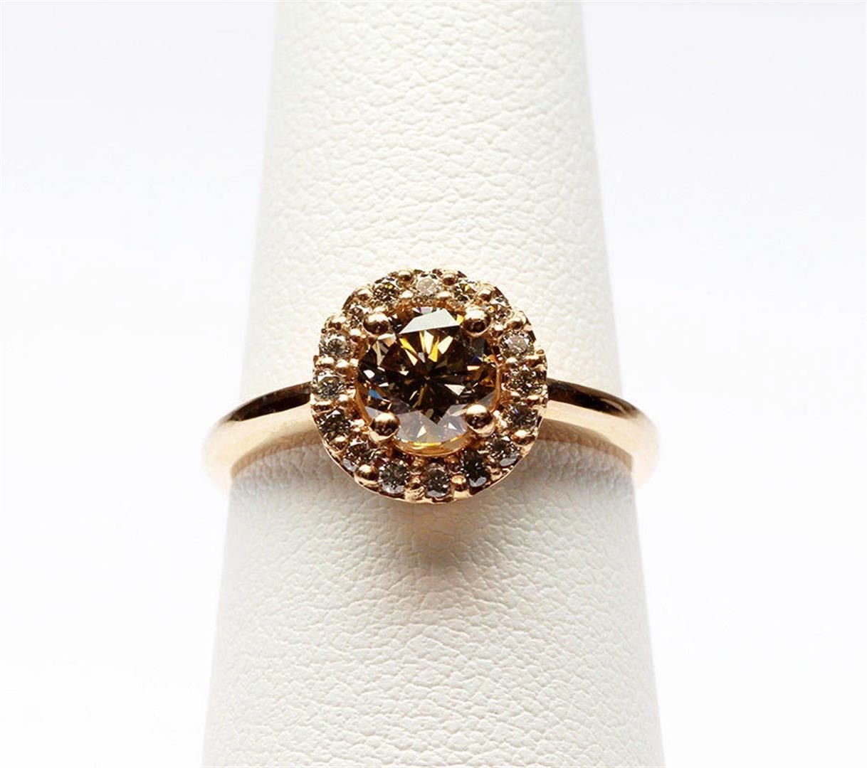 One lady's ring featuring: 14KT rose gold weighing 3.80 grams containing one center diamond weighing 1.04ct and 16 side diamonds weighing 0.23ctw, The center diamond is round brilliant cut with SI1 clarity, I-J color and excellent cut. The side diamonds a