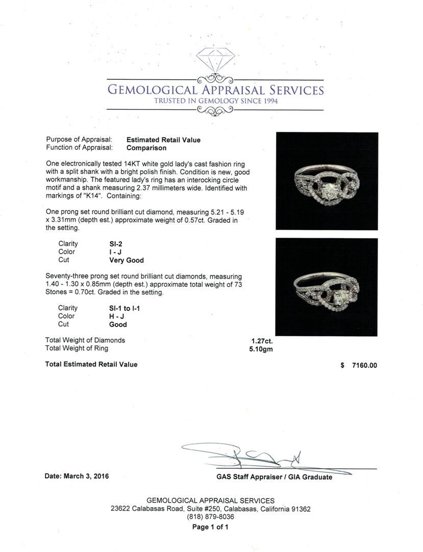 One electronically tested 14KT white gold lady's cast fashion ring with a split shank with a bright polish finish. The featured lady's ring has an interlocking circle motif and a shank measuring 2.37 millimeters wide. Identified with markings of "K14". Condition is new, good workmanship. Containing: One prong set round brilliant cut diamond, measuring 5.21 - 5.19 x 3.31mm (depth est.) approximate weight of 0.57ct. Graded in the setting. Clarity: SI-2. Color: I - J. Cut Very Good Seventy-Three prong set round brilliant cut diamonds, measuring 1.40 - 1.30 x 0.85mm (depth est.) approximate total weight of 73 Stones = 0.70ct. Graded in the setting. Clarity: SI-1 to I-1. Color: H - Good. Total Weight of Diamonds 1.27ct. Total Weight of Ring 5.10gm. GAS Appraised at $7,160.00.