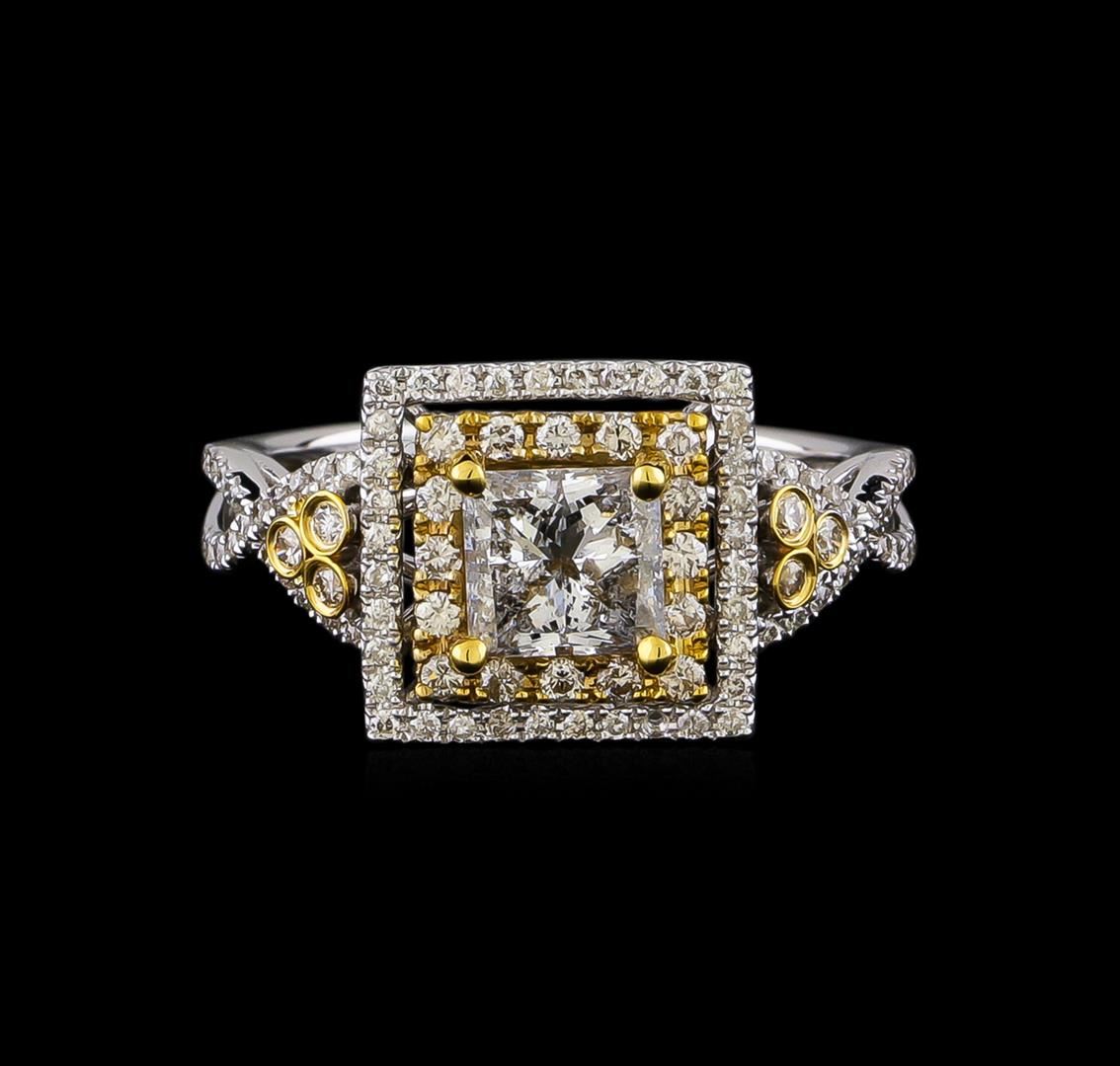 One electronically tested 14KT white gold ladies cast diamond unity ring. Condition is new, good workmanship. The featured diamond is set within an inner yellow gold diamond bezel and outer white gold diamond bezel supported by stylized diamond set shoulders, completed by a one millimeter wide band. Bright polish finish with yellow gold accents. Identified with markings of 14K. Containing: One prong set princess cut diamond, measuring 5.50 x 5.30 - 3.50mm (depth est.) approximate weight of 0.84ct with a faint blue fluorescence. Graded in the setting. Clarity: I-2. Color: E. Depth: 66.0%. Table: 73.6%. Polish: Good. Symmetry: Good. Twenty-two prong & bezel set round brilliant cut diamonds, measuring 1.30 - 1.30 x 0.78mm (depth est.) approximate total weight of 22 stones = 0.22ct. Graded in the setting. Clarity: SI-2 to I-2. Color: H - J. Seventy-four prong set round brilliant cut diamonds, measuring 0.90 - 0.80 x 0.51mm (depth est.) approximate total weight of 74 Stones = 0.21ct. Color & clarity grade are an average for the group. Graded in the setting. Clarity: SI-2 to I-1. Color: H-J. Total Weight of Diamonds: 1.27ct. Total weight of ring: 3.33 gm. AIG Appraised at $6,105.00.