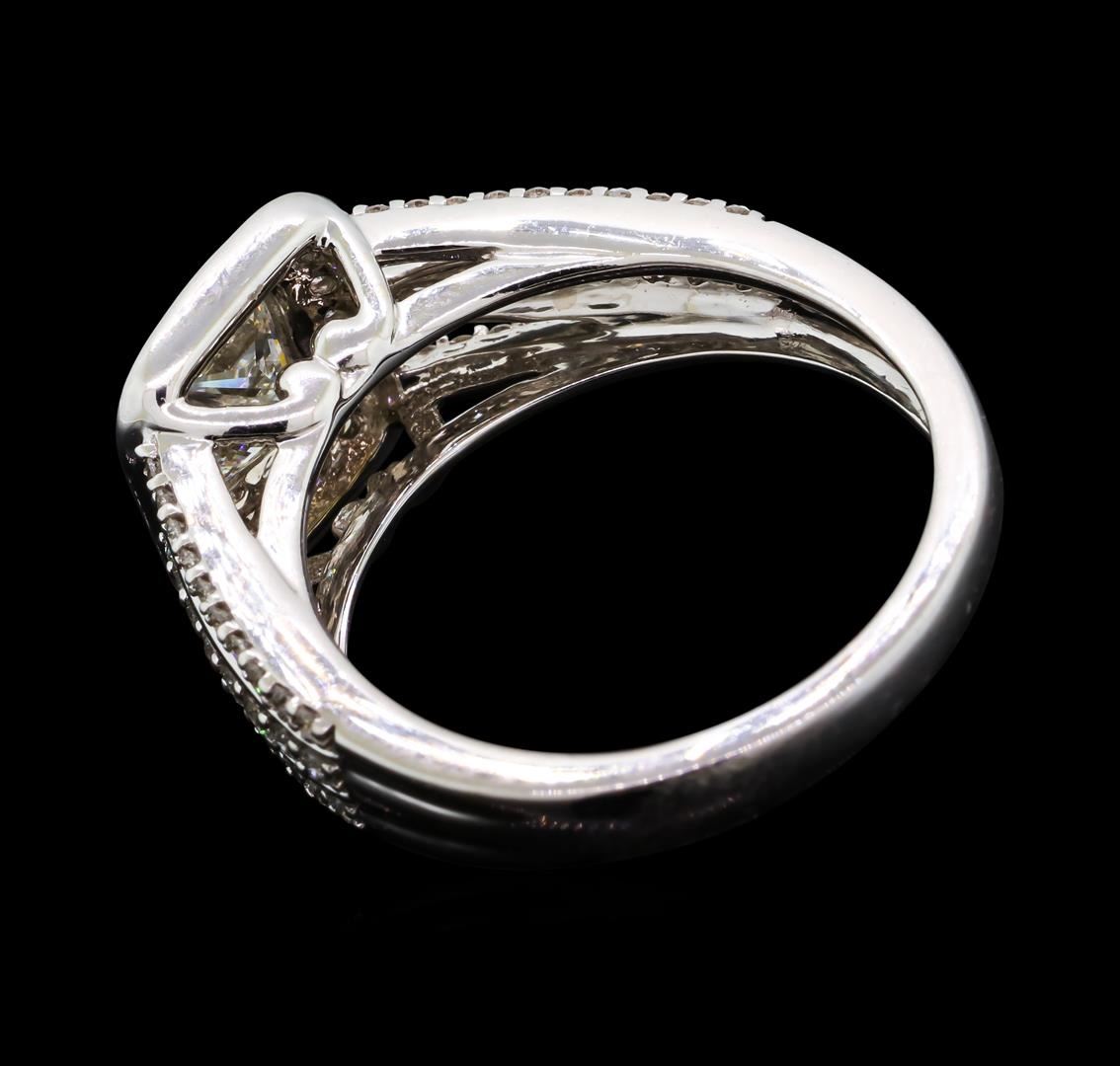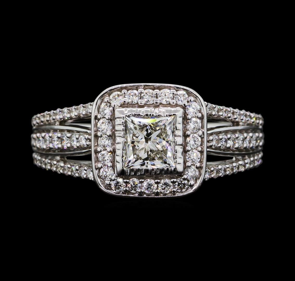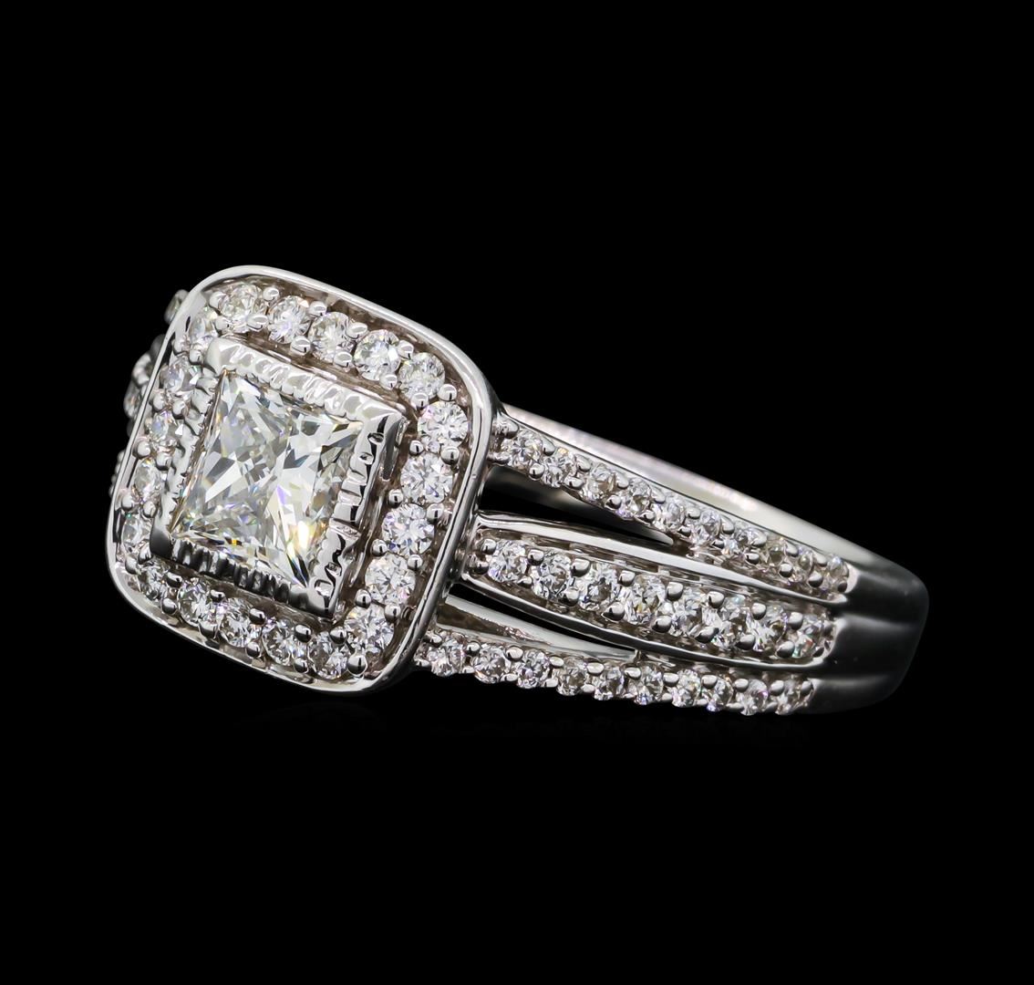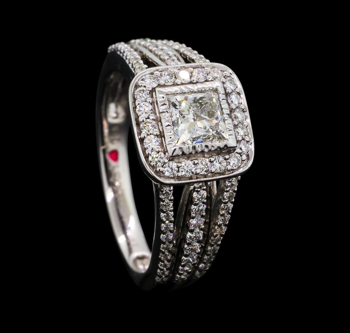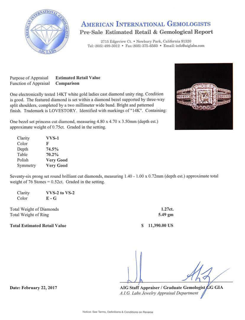 One electronically tested 14KT white gold ladies cast diamond unity ring. The featured diamond is set within a diamond bezel supported by three-way split shoulders, completed by a two millimeter wide band. Bright and patterned finish. Trademark is LOVESTORY. Identified with markings of '14K'. Condition is good. Containing: One bezel set princess cut diamond, measuring 4.80 x 4.70 x 3.50mm (depth est.) approximate weight of 0.75ct. Graded in the setting. Clarity VVS-1. Color: F Depth 74.5%. Table: 70.2%. Seventy-Six prong set round brilliant cut diamonds, measuring 1.40 - 1.00 x 0.72mm (depth est.) approximate total weight of 76 Stones = 0.52ct. Graded in the setting. Clarity VVS-2 to VS-2. Color: E - G. Total Weight of Diamonds 1.27ct.. Total Weight of Ring 5.49gm. AIG Appraised at $11,390.00.