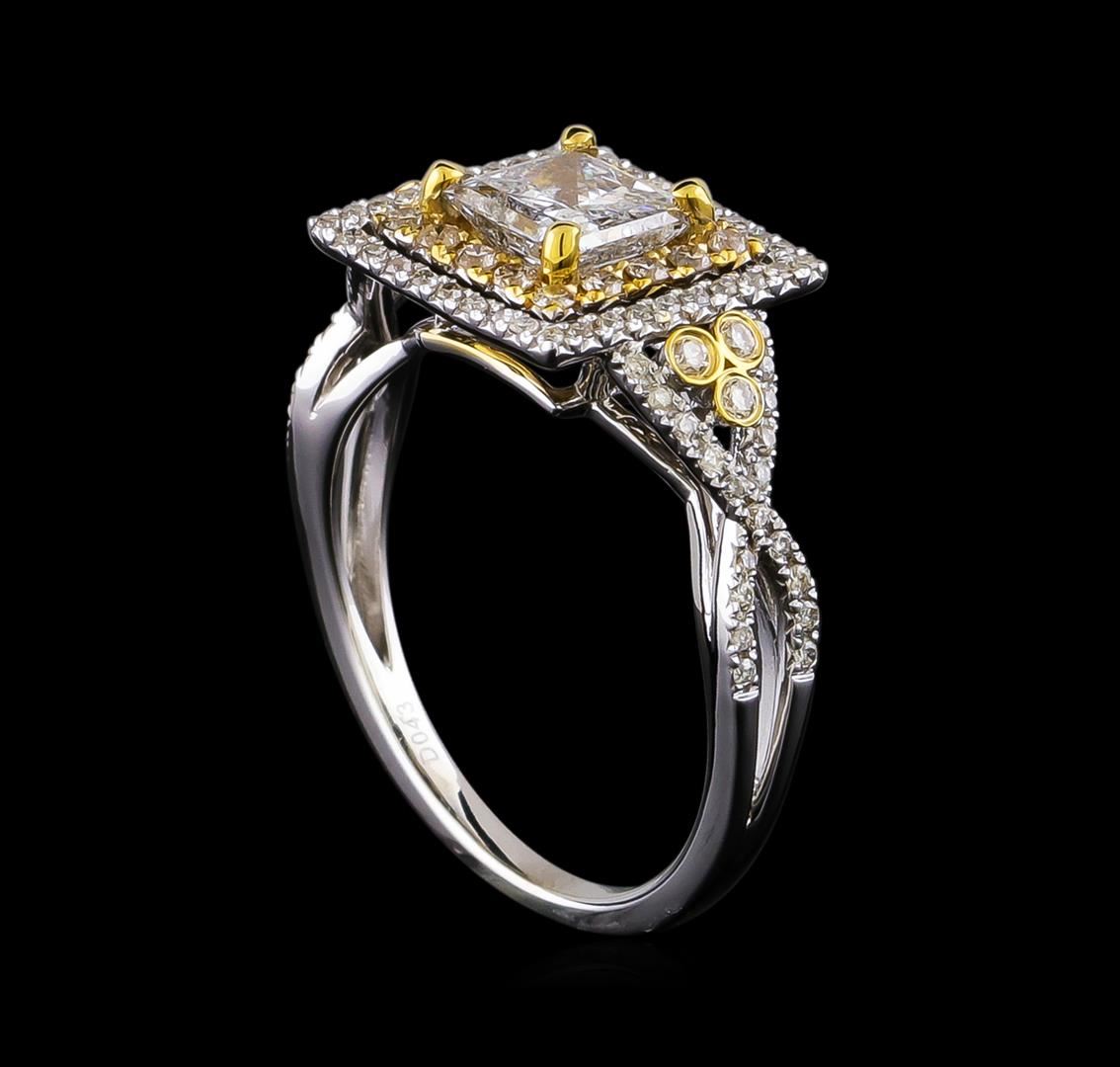 One electronically tested 14KT white gold ladies cast diamond unity ring. Condition is new, good workmanship. The featured diamond is set within an inner yellow gold diamond bezel and outer white gold diamond bezel supported by stylized diamond set shoulders, completed by a one millimeter wide band. Bright polish finish with yellow gold accents. Identified with markings of 14K. Containing: One prong set princess cut diamond, measuring 5.50 x 5.30 - 3.50mm (depth est.) approximate weight of 0.84ct with a faint blue fluorescence. Graded in the setting. Clarity: I-2. Color: E. Depth: 66.0%. Table: 73.6%. Polish: Good. Symmetry: Good. Twenty-two prong & bezel set round brilliant cut diamonds, measuring 1.30 - 1.30 x 0.78mm (depth est.) approximate total weight of 22 stones = 0.22ct. Graded in the setting. Clarity: SI-2 to I-2. Color: H - J. Seventy-four prong set round brilliant cut diamonds, measuring 0.90 - 0.80 x 0.51mm (depth est.) approximate total weight of 74 Stones = 0.21ct. Color & clarity grade are an average for the group. Graded in the setting. Clarity: SI-2 to I-1. Color: H-J. Total Weight of Diamonds: 1.27ct. Total weight of ring: 3.33 gm. AIG Appraised at $6,105.00.