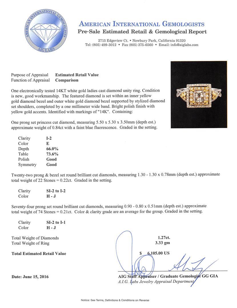 One electronically tested 14KT white gold ladies cast diamond unity ring. Condition is new, good workmanship. The featured diamond is set within an inner yellow gold diamond bezel and outer white gold diamond bezel supported by stylized diamond set shoulders, completed by a one millimeter wide band. Bright polish finish with yellow gold accents. Identified with markings of 14K. Containing: One prong set princess cut diamond, measuring 5.50 x 5.30 - 3.50mm (depth est.) approximate weight of 0.84ct with a faint blue fluorescence. Graded in the setting. Clarity: I-2. Color: E. Depth: 66.0%. Table: 73.6%. Polish: Good. Symmetry: Good. Twenty-two prong & bezel set round brilliant cut diamonds, measuring 1.30 - 1.30 x 0.78mm (depth est.) approximate total weight of 22 stones = 0.22ct. Graded in the setting. Clarity: SI-2 to I-2. Color: H - J. Seventy-four prong set round brilliant cut diamonds, measuring 0.90 - 0.80 x 0.51mm (depth est.) approximate total weight of 74 Stones = 0.21ct. Color & clarity grade are an average for the group. Graded in the setting. Clarity: SI-2 to I-1. Color: H-J. Total Weight of Diamonds: 1.27ct. Total weight of ring: 3.33 gm. AIG Appraised at $6,105.00.