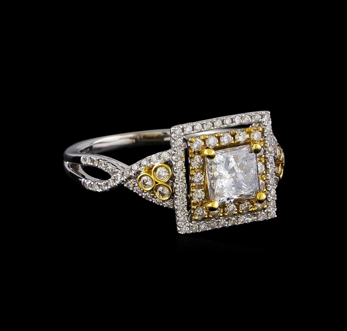 One electronically tested 14KT white gold ladies cast diamond unity ring. Condition is new, good workmanship. The featured diamond is set within an inner yellow gold diamond bezel and outer white gold diamond bezel supported by stylized diamond set shoulders, completed by a one millimeter wide band. Bright polish finish with yellow gold accents. Identified with markings of 14K. Containing: One prong set princess cut diamond, measuring 5.50 x 5.30 - 3.50mm (depth est.) approximate weight of 0.84ct with a faint blue fluorescence. Graded in the setting. Clarity: I-2. Color: E. Depth: 66.0%. Table: 73.6%. Polish: Good. Symmetry: Good. Twenty-two prong & bezel set round brilliant cut diamonds, measuring 1.30 - 1.30 x 0.78mm (depth est.) approximate total weight of 22 stones = 0.22ct. Graded in the setting. Clarity: SI-2 to I-2. Color: H - J. Seventy-four prong set round brilliant cut diamonds, measuring 0.90 - 0.80 x 0.51mm (depth est.) approximate total weight of 74 Stones = 0.21ct. Color & clarity grade are an average for the group. Graded in the setting. Clarity: SI-2 to I-1. Color: H-J. Total Weight of Diamonds: 1.27ct. Total weight of ring: 3.33 gm. AIG Appraised at $6,105.00.