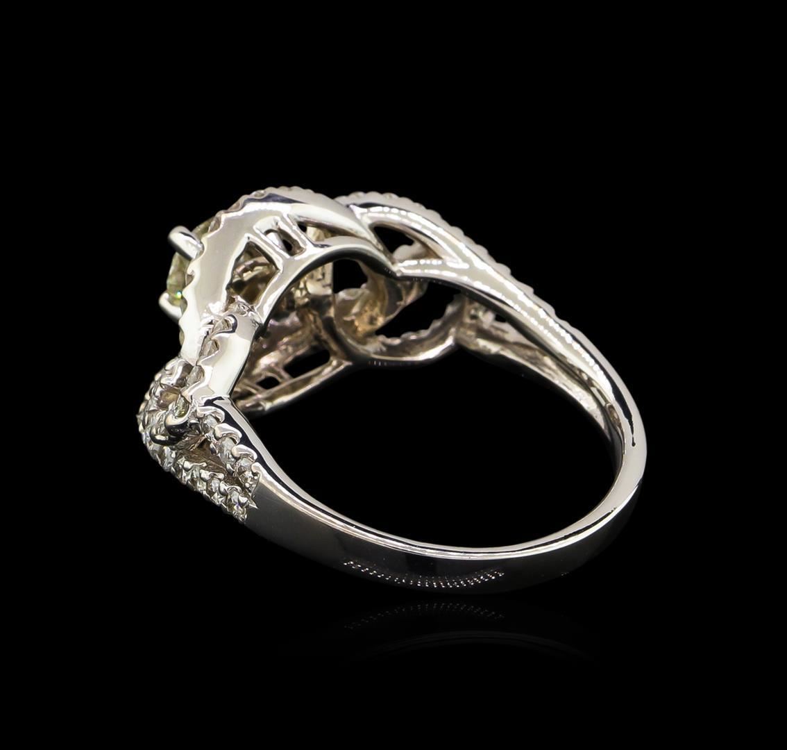 One electronically tested 14KT white gold lady's cast fashion ring with a split shank with a bright polish finish. The featured lady's ring has an interlocking circle motif and a shank measuring 2.37 millimeters wide. Identified with markings of "K14". Condition is new, good workmanship. Containing: One prong set round brilliant cut diamond, measuring 5.21 - 5.19 x 3.31mm (depth est.) approximate weight of 0.57ct. Graded in the setting. Clarity: SI-2. Color: I - J. Cut Very Good Seventy-Three prong set round brilliant cut diamonds, measuring 1.40 - 1.30 x 0.85mm (depth est.) approximate total weight of 73 Stones = 0.70ct. Graded in the setting. Clarity: SI-1 to I-1. Color: H - Good. Total Weight of Diamonds 1.27ct. Total Weight of Ring 5.10gm. GAS Appraised.