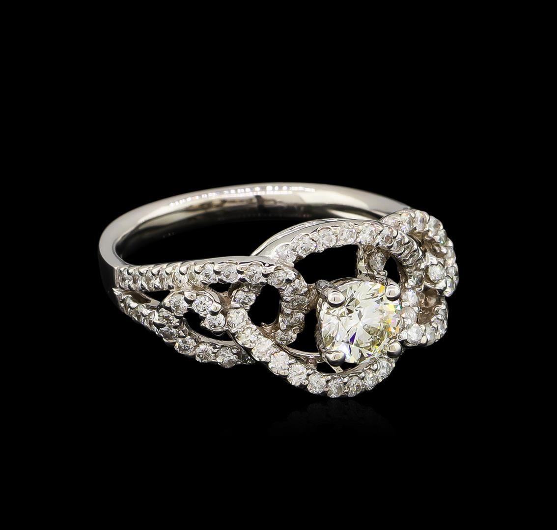 One electronically tested 14KT white gold lady's cast fashion ring with a split shank with a bright polish finish. The featured lady's ring has an interlocking circle motif and a shank measuring 2.37 millimeters wide. Identified with markings of "K14". Condition is new, good workmanship. Containing: One prong set round brilliant cut diamond, measuring 5.21 - 5.19 x 3.31mm (depth est.) approximate weight of 0.57ct. Graded in the setting. Clarity: SI-2. Color: I - J. Cut Very Good Seventy-Three prong set round brilliant cut diamonds, measuring 1.40 - 1.30 x 0.85mm (depth est.) approximate total weight of 73 Stones = 0.70ct. Graded in the setting. Clarity: SI-1 to I-1. Color: H - Good. Total Weight of Diamonds 1.27ct. Total Weight of Ring 5.10gm. GAS Appraised.