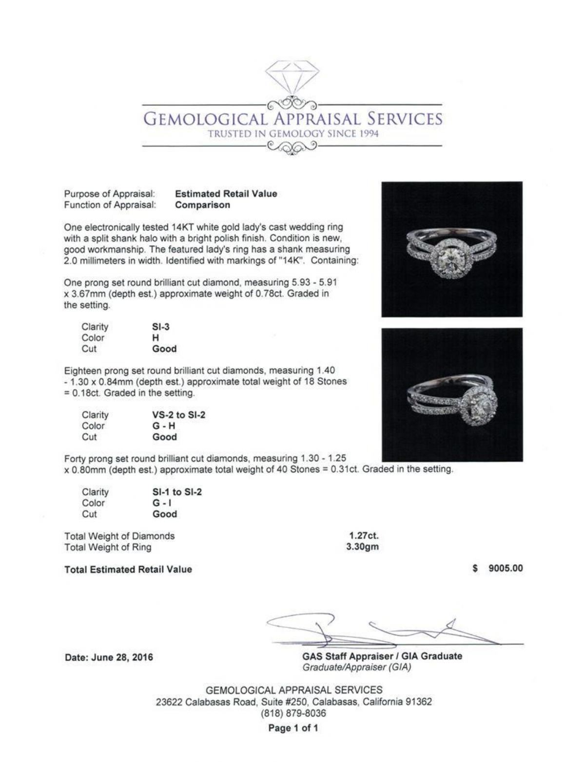 One electronically tested 14KT white gold lady's cast wedding ring with a split shank halo with a bright polish finish. The featured lady's ring has a shank measuring 2.0 millimeters in width. Identified with markings of "14K". Condition is new, good workmanship. Containing: One prong set round brilliant cut diamond, measuring 5.93 - 5.91 x 3.67mm (depth est.) approximate weight of 0.78ct. Graded in the setting. Clarity: SI-3. Color: Good Eighteen prong set round brilliant cut diamonds, measuring 1.40 - 1.30 x 0.84mm (depth est.) approximate total weight of 18 Stones = 0.18ct. Graded in the setting. Clarity: VS-2 to SI-2. Color: G - Good Forty prong set round brilliant cut diamonds, measuring 1.30 - 1.25 x 0.80mm (depth est.) approximate total weight of 40 Stones = 0.31ct. Graded in the setting. Clarity: SI-1 to SI-2. Color: G - I. Cut Good. Total Weight of Diamonds 1.27ct. Total Weight of Ring 3.30gm. GAS Appraised.