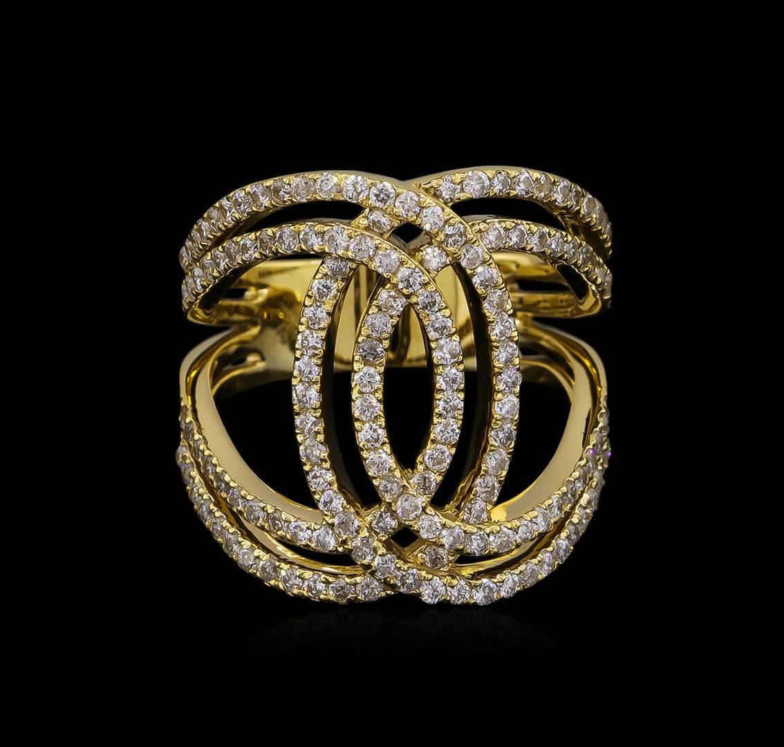 One electronically tested 14KT yellow gold lady's cast fashion ring with a tapered split shank with a bright polish finish. The featured lady's ring has a double wide band interlocking motif and a shank measuring 5.56 millimeters wide. Identified with markings of "585". Condition is new, good workmanship. Containing: One Hundred Forty-Six prong set round brilliant cut diamonds, measuring 1.35 - 1.30 x 0.82mm (depth est.) approximate total weight of 146 Stones = 1.27ct. Graded in the setting. Clarity: SI-1 to I-1. Color: H - I. Cut Good. Total Weight of Diamonds 1.27ct. Total Weight of Ring 8.10gm. GAS Appraised at $5,540.00.