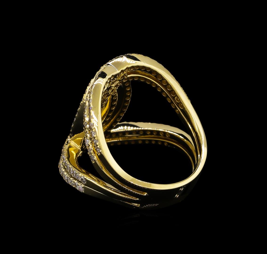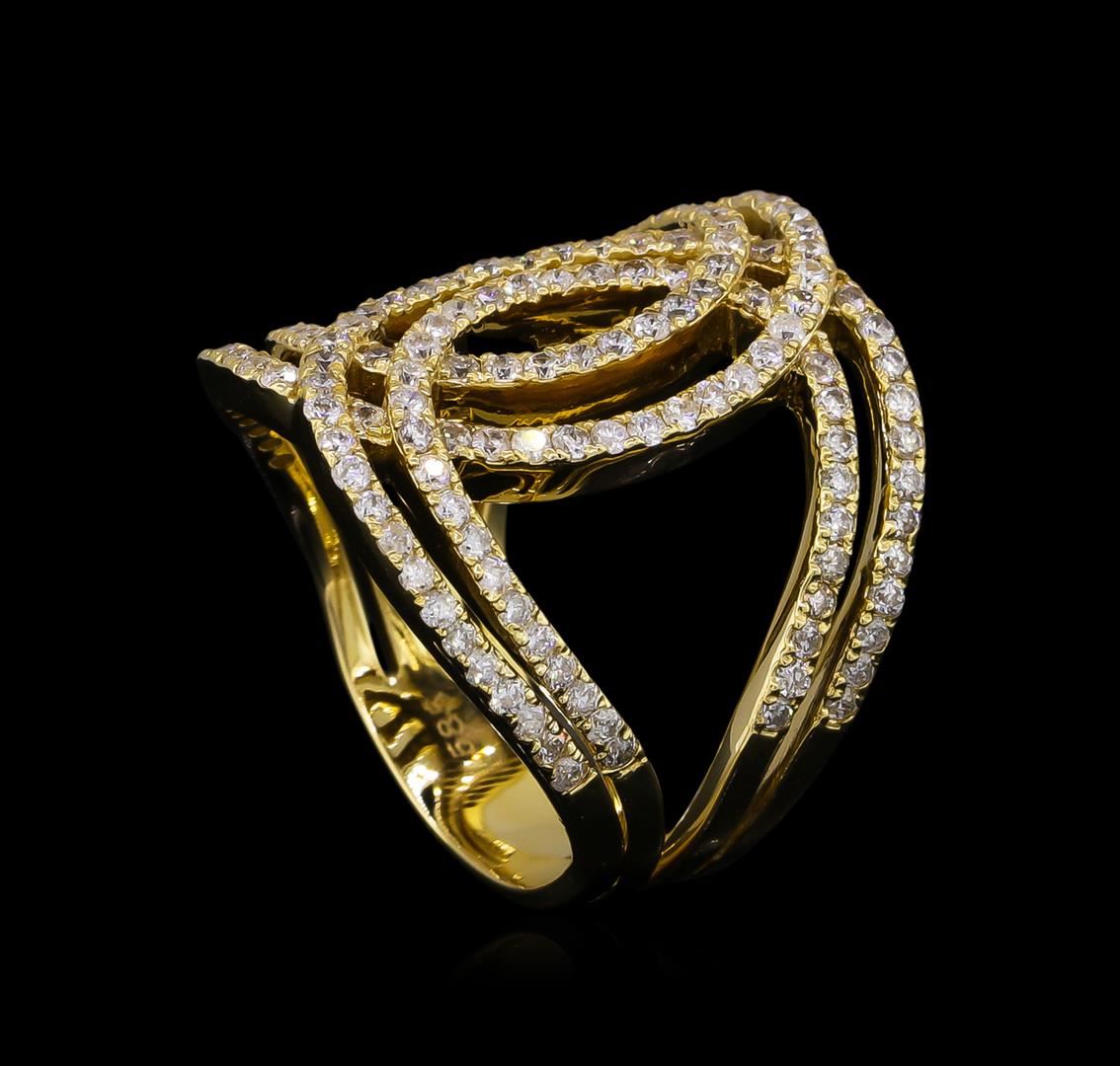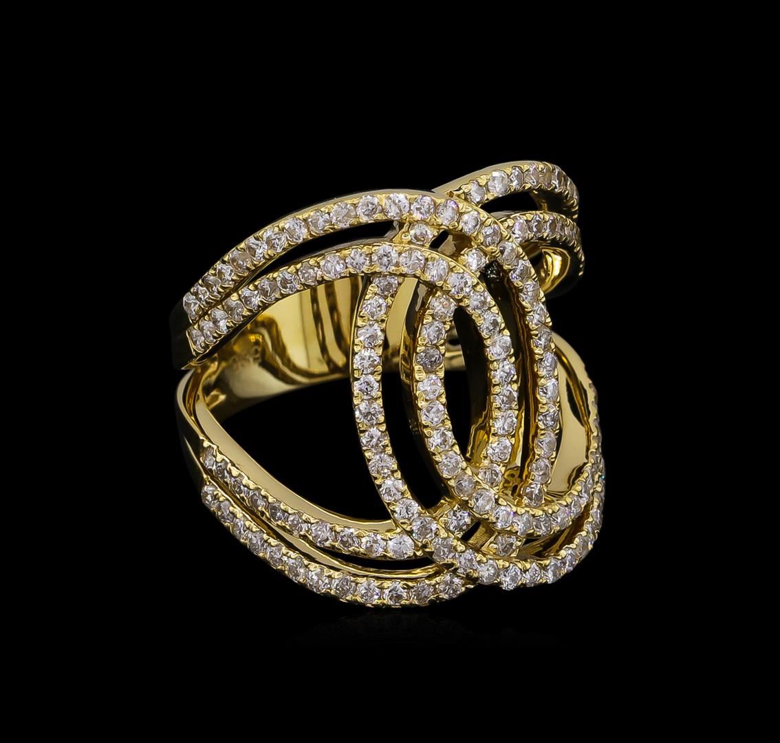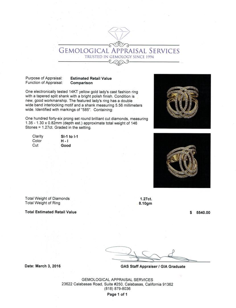 One electronically tested 14KT yellow gold lady's cast fashion ring with a tapered split shank with a bright polish finish. The featured lady's ring has a double wide band interlocking motif and a shank measuring 5.56 millimeters wide. Identified with markings of "585". Condition is new, good workmanship. Containing: One Hundred Forty-Six prong set round brilliant cut diamonds, measuring 1.35 - 1.30 x 0.82mm (depth est.) approximate total weight of 146 Stones = 1.27ct. Graded in the setting. Clarity: SI-1 to I-1. Color: H - I. Cut Good. Total Weight of Diamonds 1.27ct. Total Weight of Ring 8.10gm. GAS Appraised at $5,540.00.