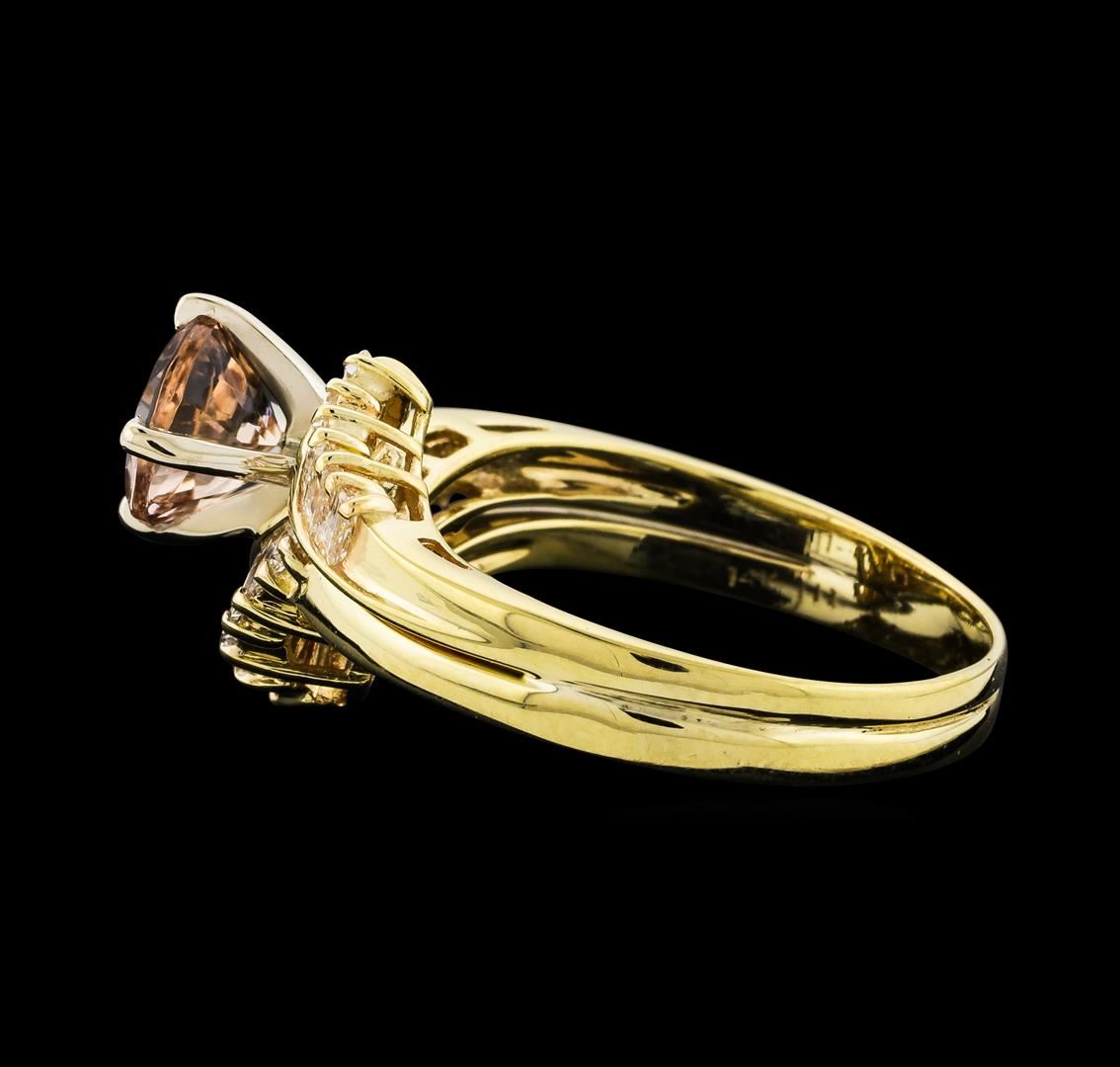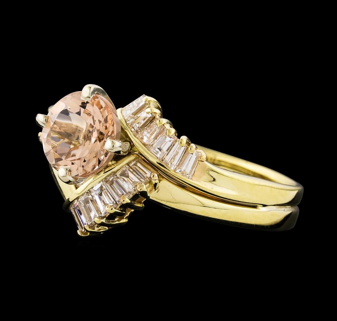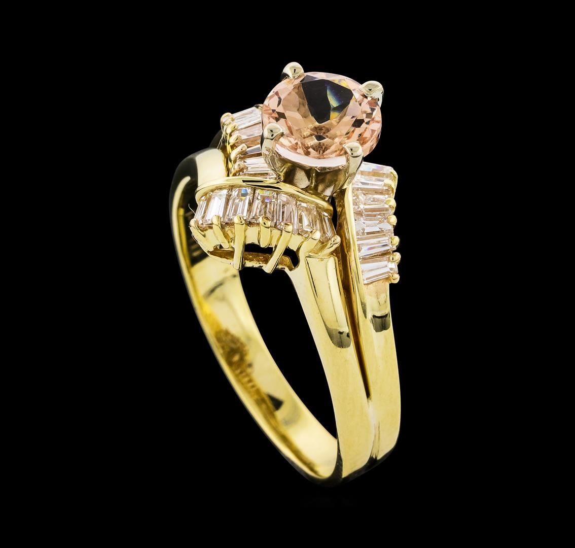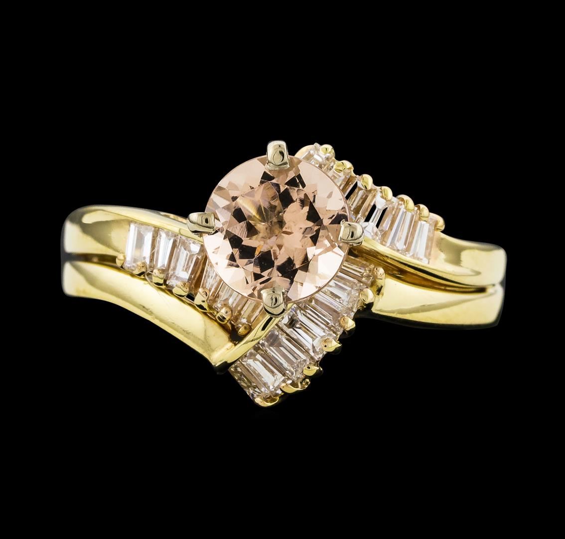 One Morganite and Diamond Ring featuring: 14KT Yellow Gold with a total weight of 5.00 grams, Morganite with a total weight of 1.27ct, and side diamonds with a total weight of 0.50ctw.