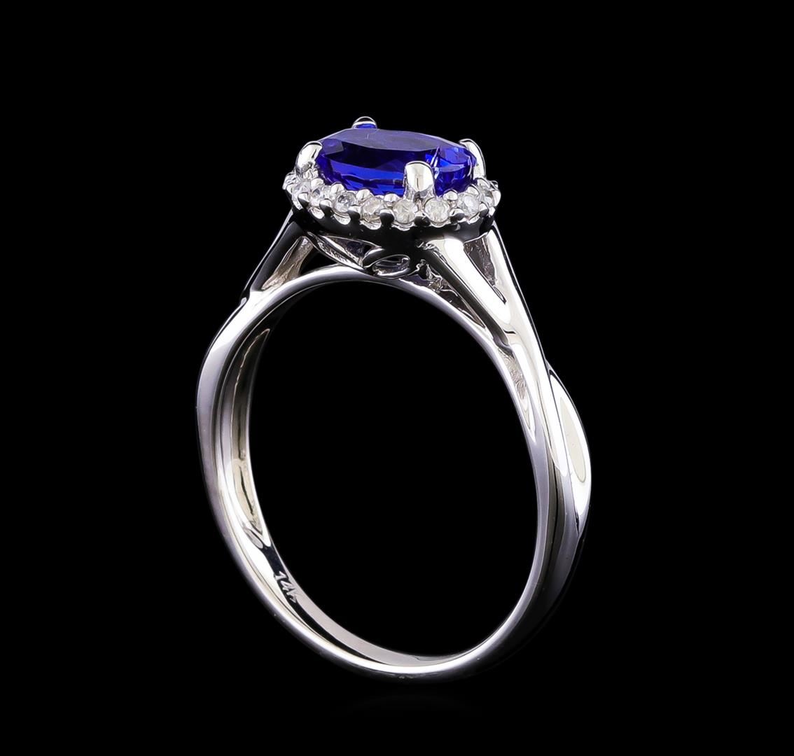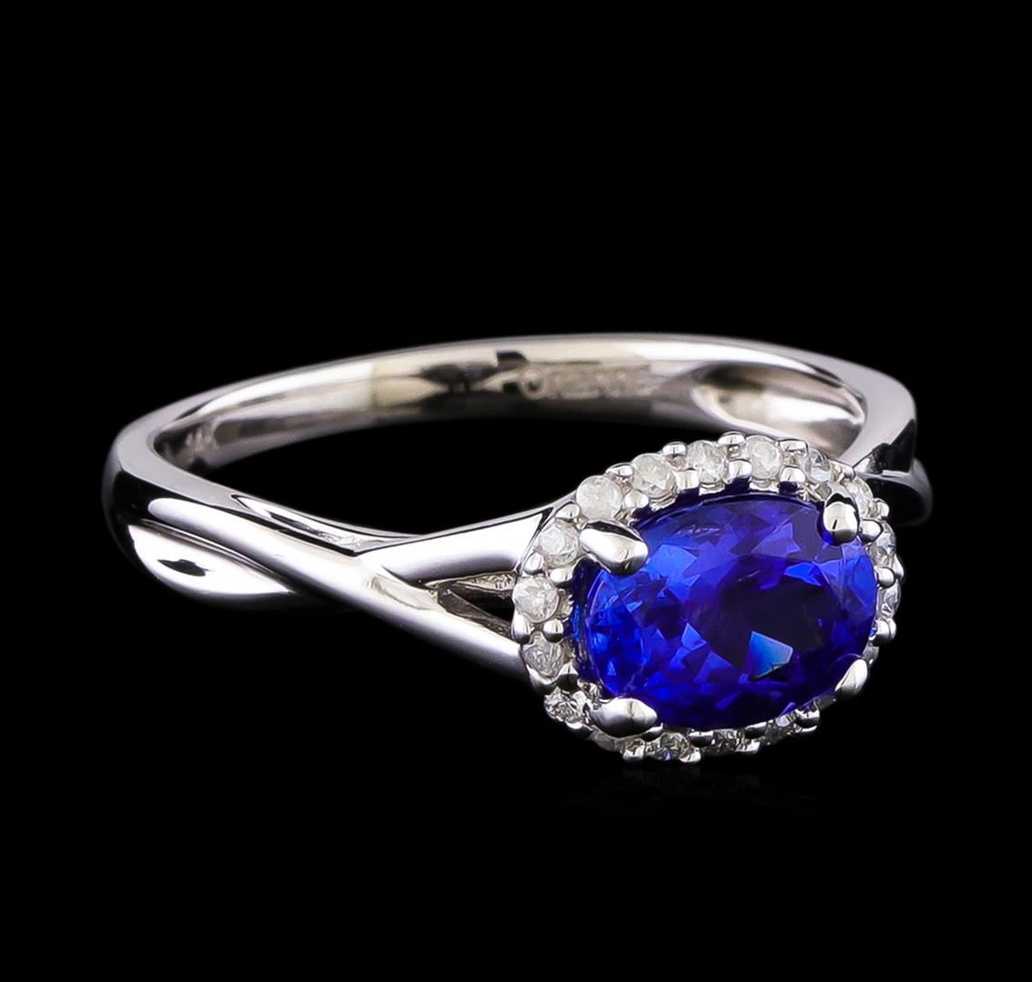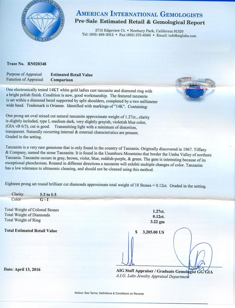 One electronically tested 14KT white gold ladies cast tanzanite and diamond ring with a bright polish finish. The featured tanzanite is set within a diamond bezel supported by split shoulders, completed by a two millimeter wide band. Trademark is Orianne. Identified with markings of "14K". Condition is new, good workmanship. Containing: One prong set oval mixed cut natural tanzanite approximate weight of 1.27ct., clarity is slightly included, type I, medium dark, very slightly grayish, violetish blue color, (GIA vB 6/3), cut is good. Transmitting light with a minimum of distortion, transparent. Naturally occurring internal & external characteristics are present. Graded in the setting. Tanzanite is a very rare gemstone that is only found in the country of Tanzania. Originally discovered in 1967. Tiffany & Company, named the stone Tanzanite. It is found in the Usumburu Mountains that border the Umba Valley of northern Tanzania. Tanzanite occurs in gray, brown, violet, blue, reddish-purple, & green. The gem is interesting because of its exceptional pleochroism. Rotated in different directions a tanzanite will exhibit multiple changes of color. Tanzanite has a low tolerance to ultrasonic cleaning, and should not be cleaned using this method. Eighteen prong set round brilliant cut diamonds approximate total weight of 18 Stones = 0.12ct. Graded in the setting. Clarity: I-2 to I-3. Color: G - I. Total Weight of Colored Stones 1.27ct. Total Weight of Diamonds 0.12ct. Total Weight of Ring 3.22gm. AIG Appraised at $3,205.00.