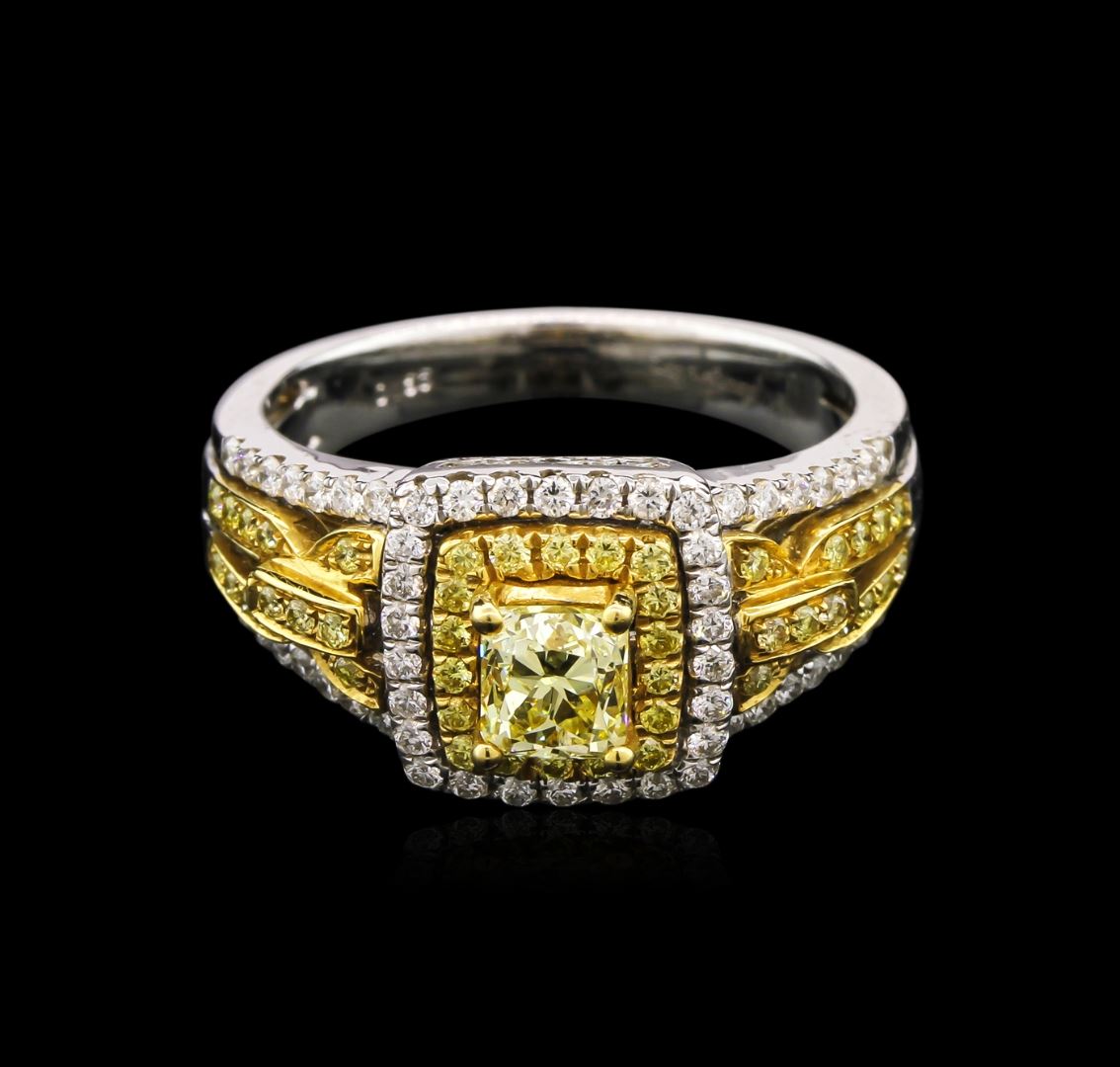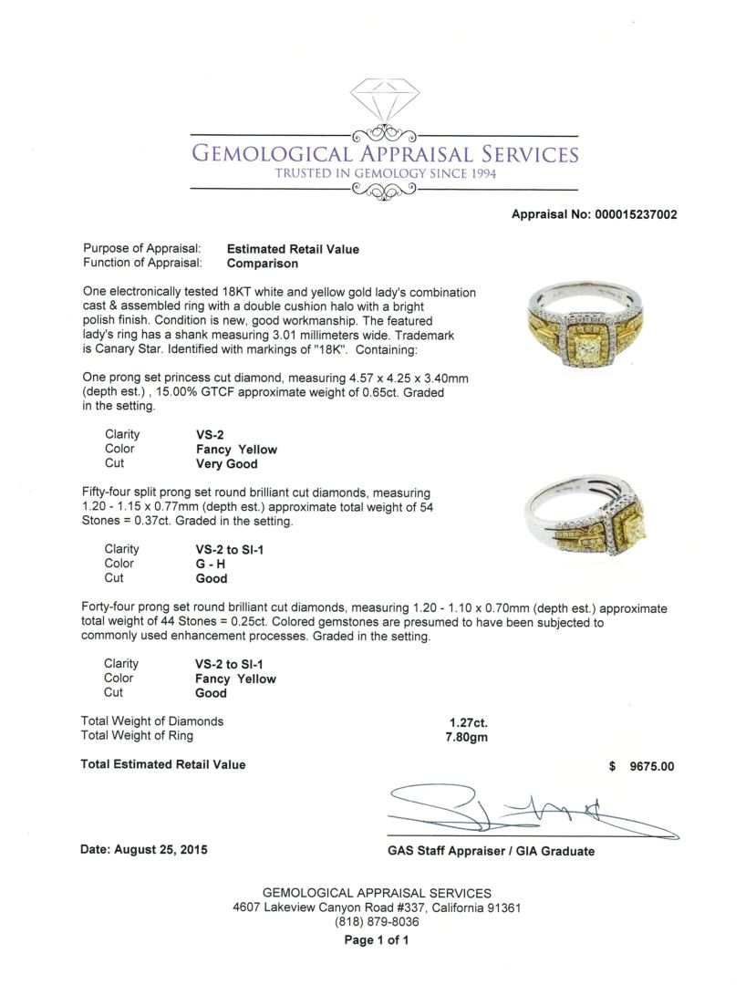 One electronically tested 18KT white and yellow gold lady's combination cast & assembled ring with a double cushion halo with a bright polish finish. The featured lady's ring has a shank measuring 3.01 millimeters wide. Trademark is Canary Star. Identified with markings of "18K". Condition is new, good workmanship. Containing: One prong set princess cut diamond, measuring 4.57 x 4.25 x 3.40mm (depth est.) , 15.00.% GTCF approximate weight of 0.65ct. Graded in the setting. Clarity: VS-2 Cut Very Good Fifty-Four split prong set round brilliant cut diamonds, measuring 1.20 - 1.15 x 0.77mm (depth est.) approximate total weight of 54 Stones = 0.37ct. Graded in the setting. Clarity: VS-2 to SI-1. Color: G - Good Forty-Four prong set round brilliant cut diamonds, measuring 1.20 - 1.10 x 0.70mm (depth est.) approximate total weight of 44 Stones = 0.25ct. Colored gemstones are presumed to have been subjected to commonly used enhancement processes. Graded in the setting. Clarity: VS-2 to SI-1 Cut Good. Total Weight of Diamonds 1.27ct. Total Weight of Ring 7.80gm. GAS Appraised at $9,675.00.