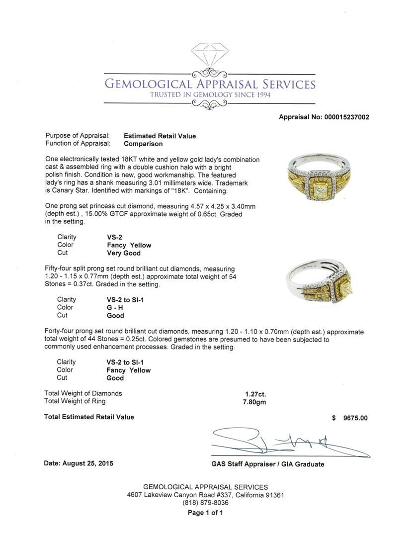 One electronically tested 18KT white and yellow gold lady's combination cast & assembled ring with a double cushion halo with a bright polish finish. The featured lady's ring has a shank measuring 3.01 millimeters wide. Trademark is Canary Star. Identified with markings of "18K". Condition is new, good workmanship. Containing: One prong set princess cut diamond, measuring 4.57 x 4.25 x 3.40mm (depth est.) , 15.00.% GTCF approximate weight of 0.65ct. Graded in the setting. Clarity: VS-2 Cut Very Good Fifty-Four split prong set round brilliant cut diamonds, measuring 1.20 - 1.15 x 0.77mm (depth est.) approximate total weight of 54 Stones = 0.37ct. Graded in the setting. Clarity: VS-2 to SI-1. Color: G - Good Forty-Four prong set round brilliant cut diamonds, measuring 1.20 - 1.10 x 0.70mm (depth est.) approximate total weight of 44 Stones = 0.25ct. Colored gemstones are presumed to have been subjected to commonly used enhancement processes. Graded in the setting. Clarity: VS-2 to SI-1 Cut Good. Total Weight of Diamonds 1.27ct. Total Weight of Ring 7.80gm. GAS Appraised at $9,675.00.