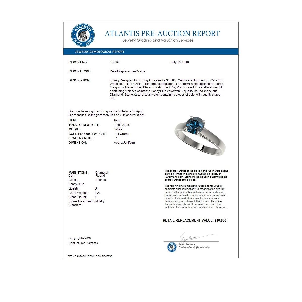 REF-147X8T -36539 ---- 1.28 CTW Certified Intense Blue SI Diamond Solitaire Engagement Ring 10K White Gold ---- Luxury Designer Brand Ring Appraised at $10,850 Certificate Number US36539 10k White gold, Ring Size is 7, Ring measuring approx. Uniform, weighing in total approx. 2.9 grams. Made in the USA and is stamped 10k, Main stone 1.28 carat total weight containing 1 pieces of Intense Fancy Blue color with SI quality Round shape cut Diamond , Stone #2 carat total weight containing pieces of color with quality shape cut
